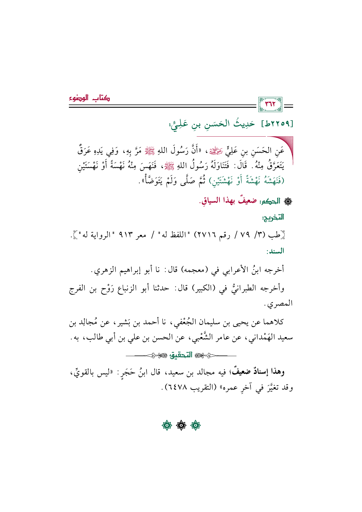 وهذا إسنادٌ ضعيفٌ؛ فيه مجالد بن سعيد، قال ابنُ حَجَرٍ: "ليس بالقويِّ، وقد تغيَّرَ في آخرِ عمره" (التقريب ٦٤٧٨).
