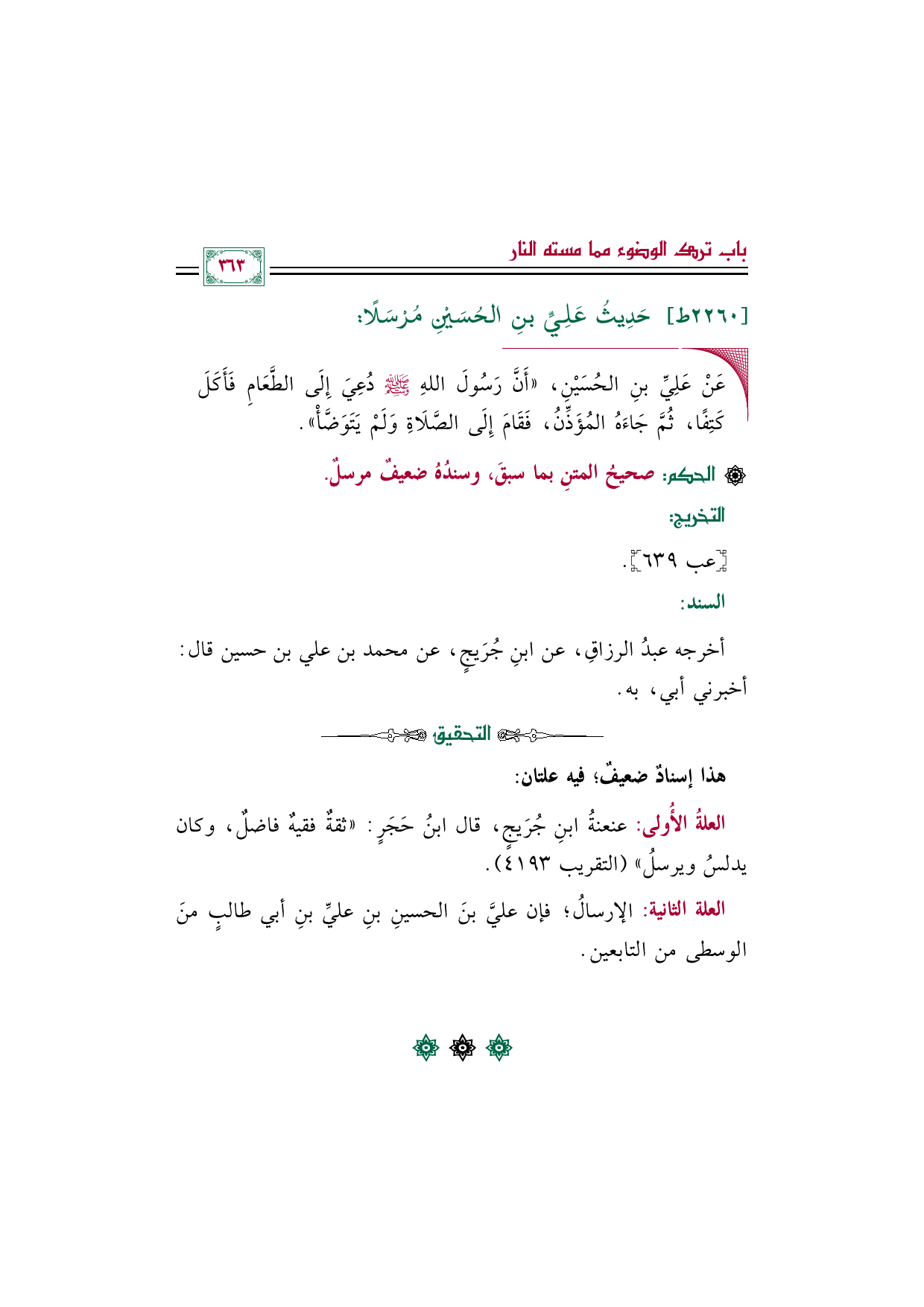 ◼ عَنْ عَلِيِّ بنِ الحُسَيْنِ، ((أَنَّ رَسُولَ اللهِ صلى الله عليه وسلم دُعِيَ إِلَى الطَّعَامِ فَأَكَلَ كَتِفًا، ثُمَّ جَاءَهُ المُؤَذِّنُ، فَقَامَ إِلَى الصَّلَاةِ وَلَمْ يَتَوَضَّأْ)).