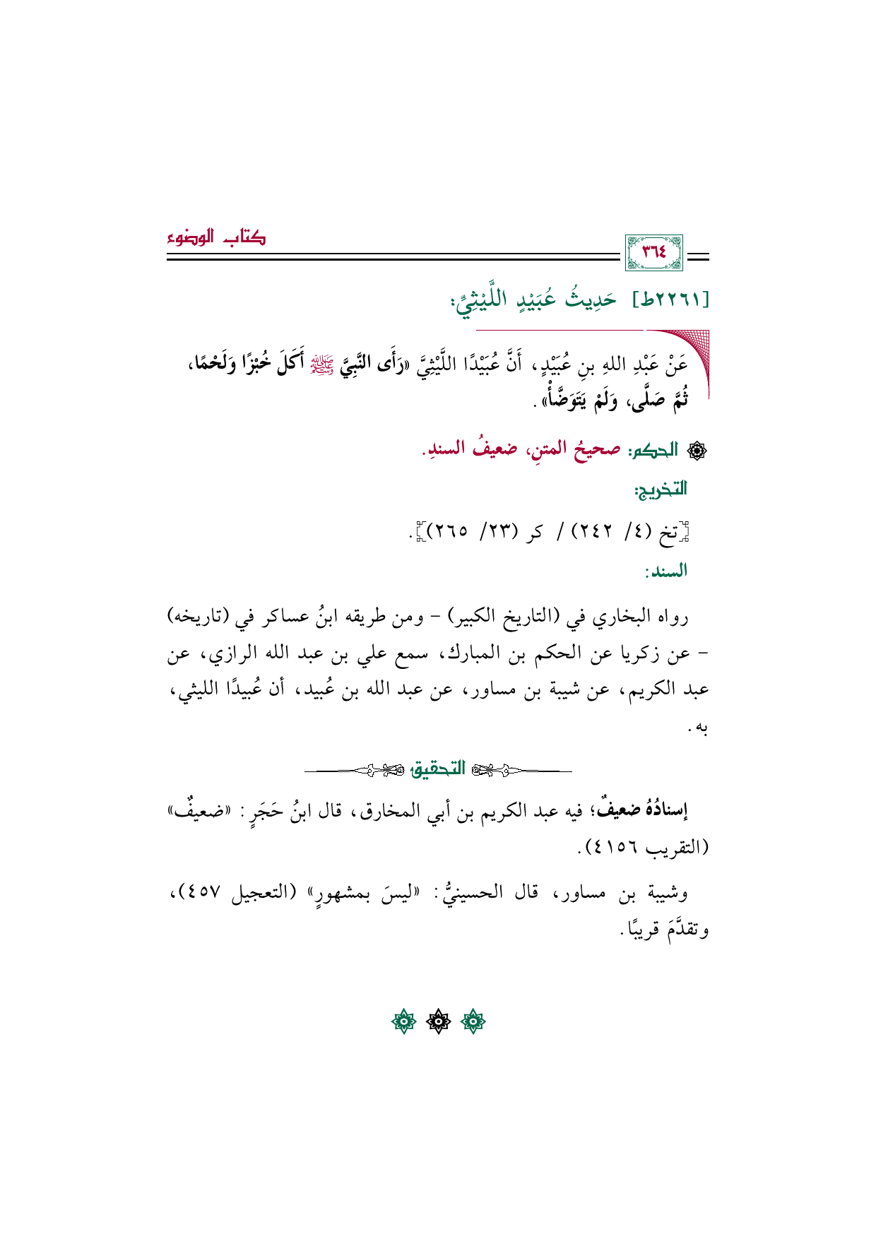 ◼ عَنْ عَبْدِ اللهِ بنِ عُبَيْدٍ، أَنَّ عُبَيْدًا اللَّيْثِيَّ ((رَأَى النَّبِيَّ صلى الله عليه وسلم أَكَلَ خُبْزًا وَلَحْمًا، ثُمَّ صَلَّى، وَلَمْ يَتَوَضَّأْ)).