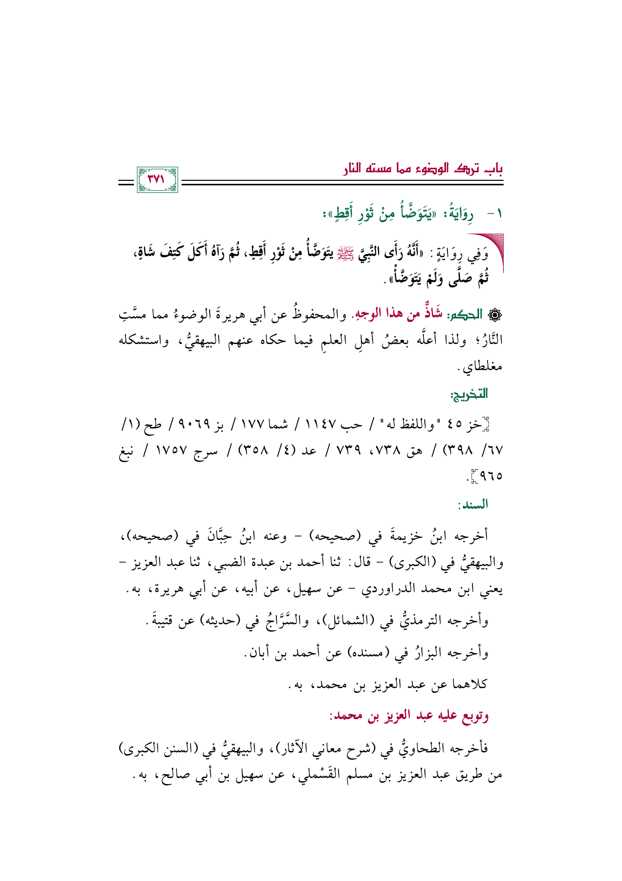 [الحكم]: شَاذٌّ من هذا الوجهِ. والمحفوظُ عن أبي هريرةَ الوضوءُ مما مسَّتِ النَّارُ؛ ولذا أعلَّه بعضُ أهلِ العلمِ فيما حكاه عنهم البيهقيُّ، واستشكله مغلطاي.