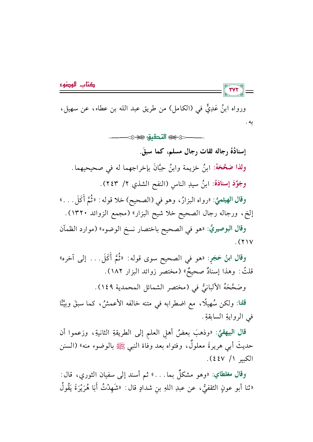 وقال ابنُ حَجَرٍ: ((هو في الصحيح سوى قوله: " ثُمَّ أَكَلَ ... إلى آخره" قلتُ: وهذا إسنادٌ صحيحٌ)) (مختصر زوائد البزار ١٨٢).