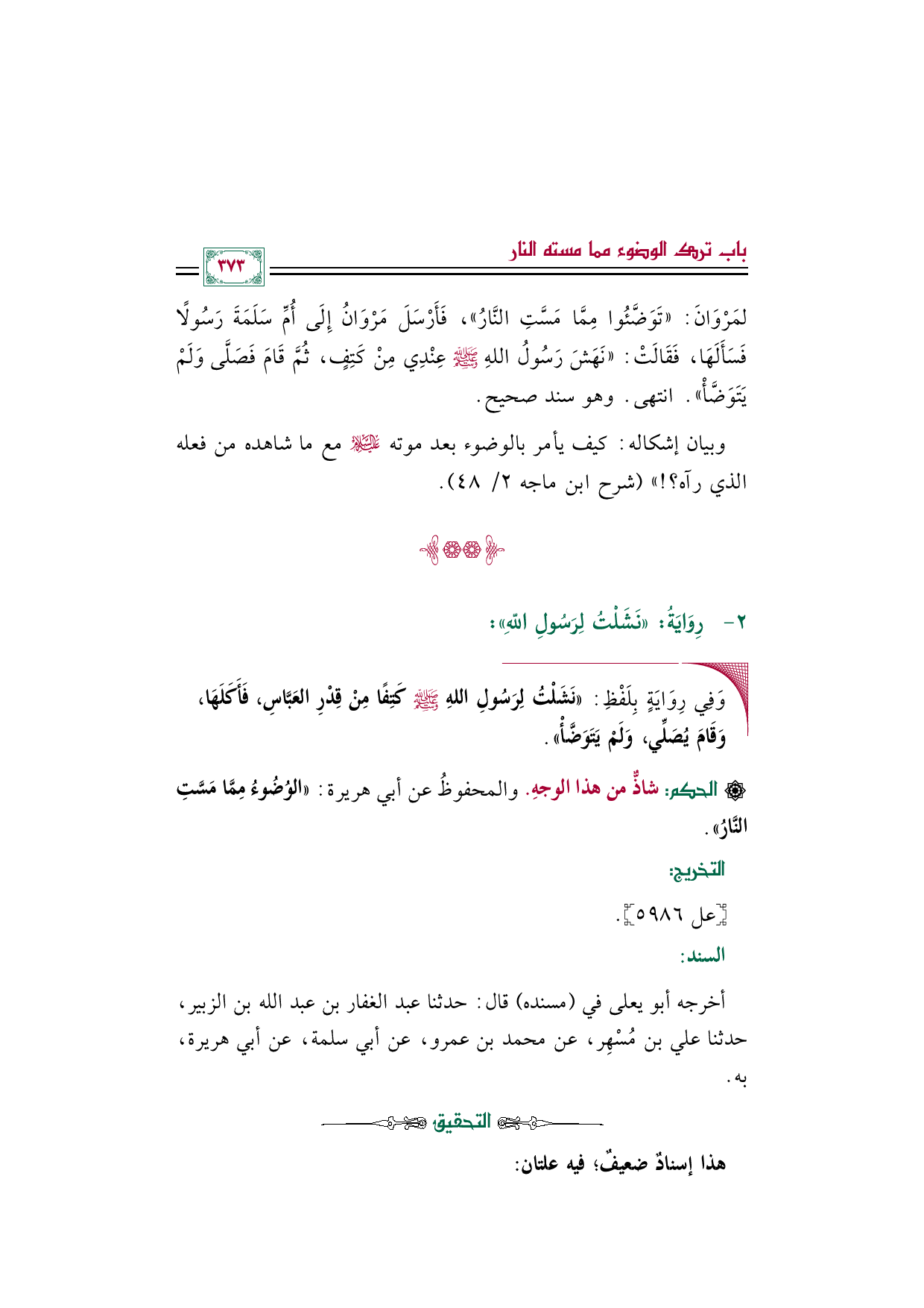 لمَرْوَانَ: "تَوَضَّئُوا مِمَّا مَسَّتِ النَّارُ"، فَأَرْسَلَ مَرْوَانُ إِلَى أُمِّ سَلَمَةَ رَسُولًا فَسَأَلَهَا، فَقَالَتْ: " نَهَشَ رَسُولُ اللهِ صلى الله عليه وسلم عِنْدِي مِنْ كَتِفٍ، ثُمَّ قَامَ فَصَلَّى وَلَمْ يَتَوَضَّأْ ". انتهى. وهو سند صحيح.