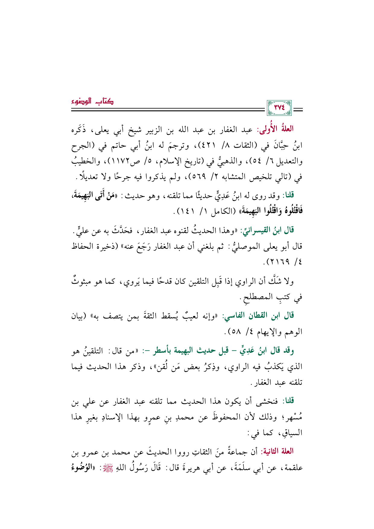 العلةُ الأُولى: عبد الغفار بن عبد الله بن الزبير شيخ أبي يعلى، ذَكَره ابنُ حِبَّانَ في (الثقات ٨/ ٤٢١)، وترجمَ له ابنُ أبي حاتم في (الجرح والتعديل ٦/ ٥٤)، والذهبيُّ في (تاريخ الإسلام، ٥/ صـ ١١٧٢)، والخطيبُ في (تالي تلخيص المتشابه ٢/ ٥٦٩)، ولم يذكروا فيه جرحًا ولا تعديلًا.