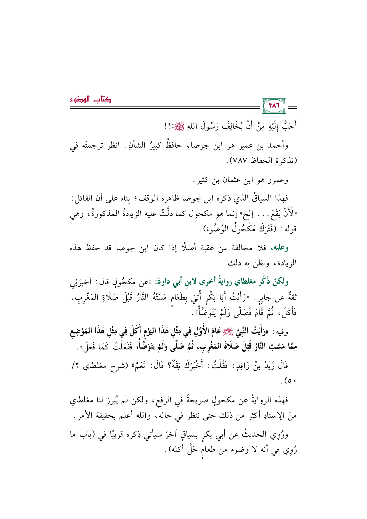 ولكنْ ذَكَر مغلطاي روايةً أخرى لابنِ أبي داودَ: "عن مكحُولٍ قال: أخبرَنِي ثقةٌ عن جابِرٍ: ((رَأَيْتُ أَبَا بَكْرٍ أُتِيَ بِطَعَامٍ مَسَّتْهُ النَّارُ قَبْلَ صَلَاةِ المَغْرِبِ، فَأَكَلَ، ثُمَّ قَامَ فَصَلَّى وَلَمْ يَتَوَضَّأْ)).