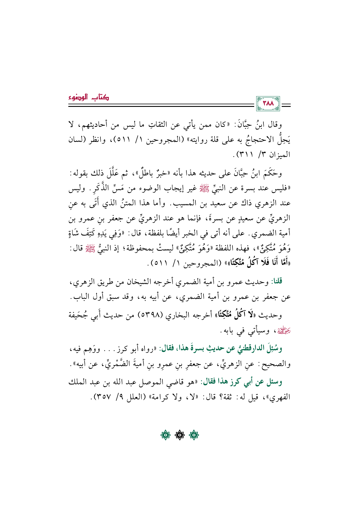 وسُئِلَ الدارقطنيُّ عن حديثِ بسرةَ هذا، فقال: "رواه أبو كرز ... ووَهِم فيه، والصحيح: عنِ الزهريِّ، عن جعفرِ بنِ عمرِو بنِ أميةَ الضَّمْريِّ، عن أبيه".