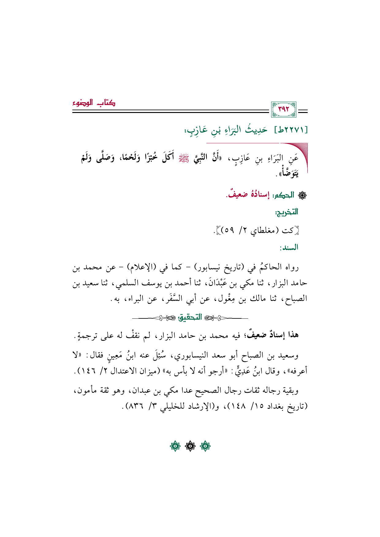 رواه الحاكمُ في (تاريخ نيسابور) -كما في (الإعلام) - عن محمد بن حامد البزار، ثنا مكي بن عَبْدَانَ، ثنا أحمد بن يوسف السلمي، ثنا سعيد بن الصباح، ثنا مالك بن مِغْول، عن أبي السَّفَر، عن البراء، به.