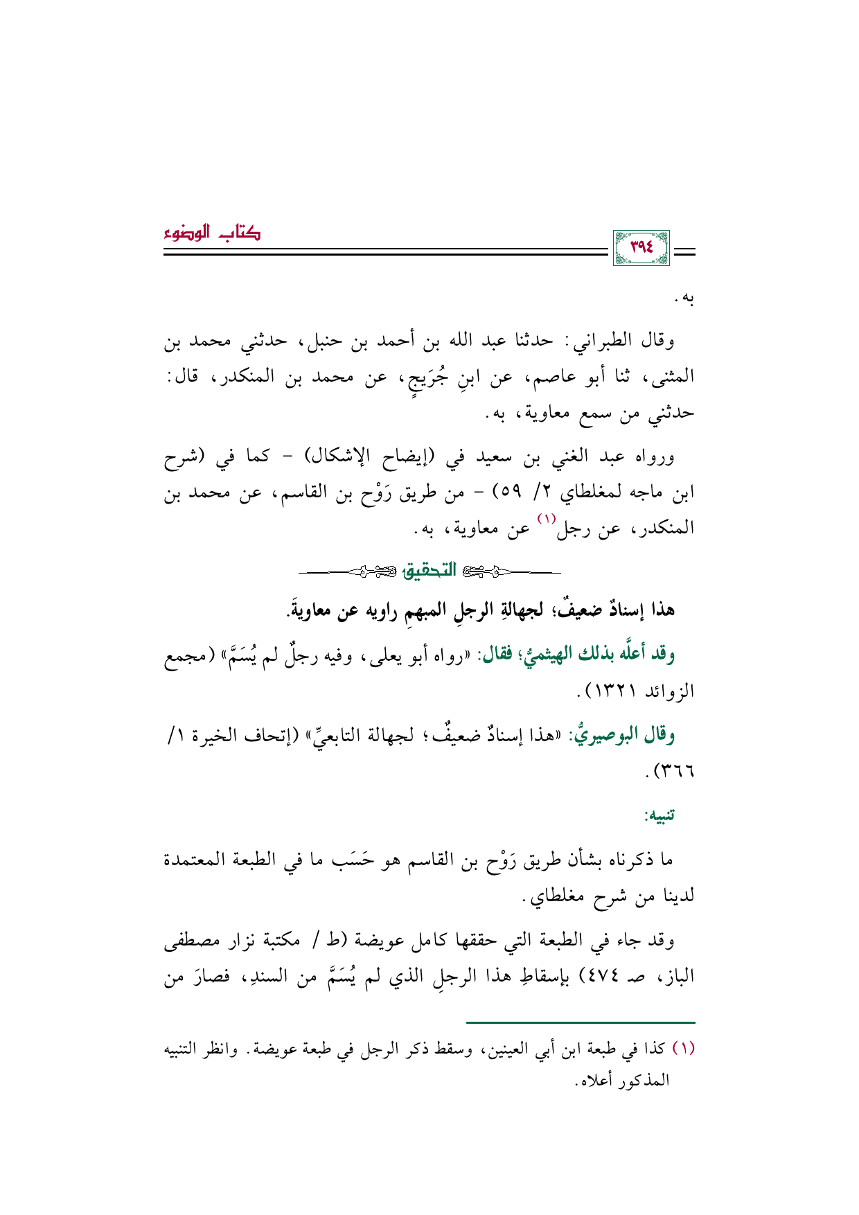 وقد جاء في الطبعة التي حققها كامل عويضة (ط/ مكتبة نزار مصطفى الباز، صـ ٤٧٤) بإسقاطِ هذا الرجلِ الذي لم يُسَمَّ من السندِ، فصارَ من