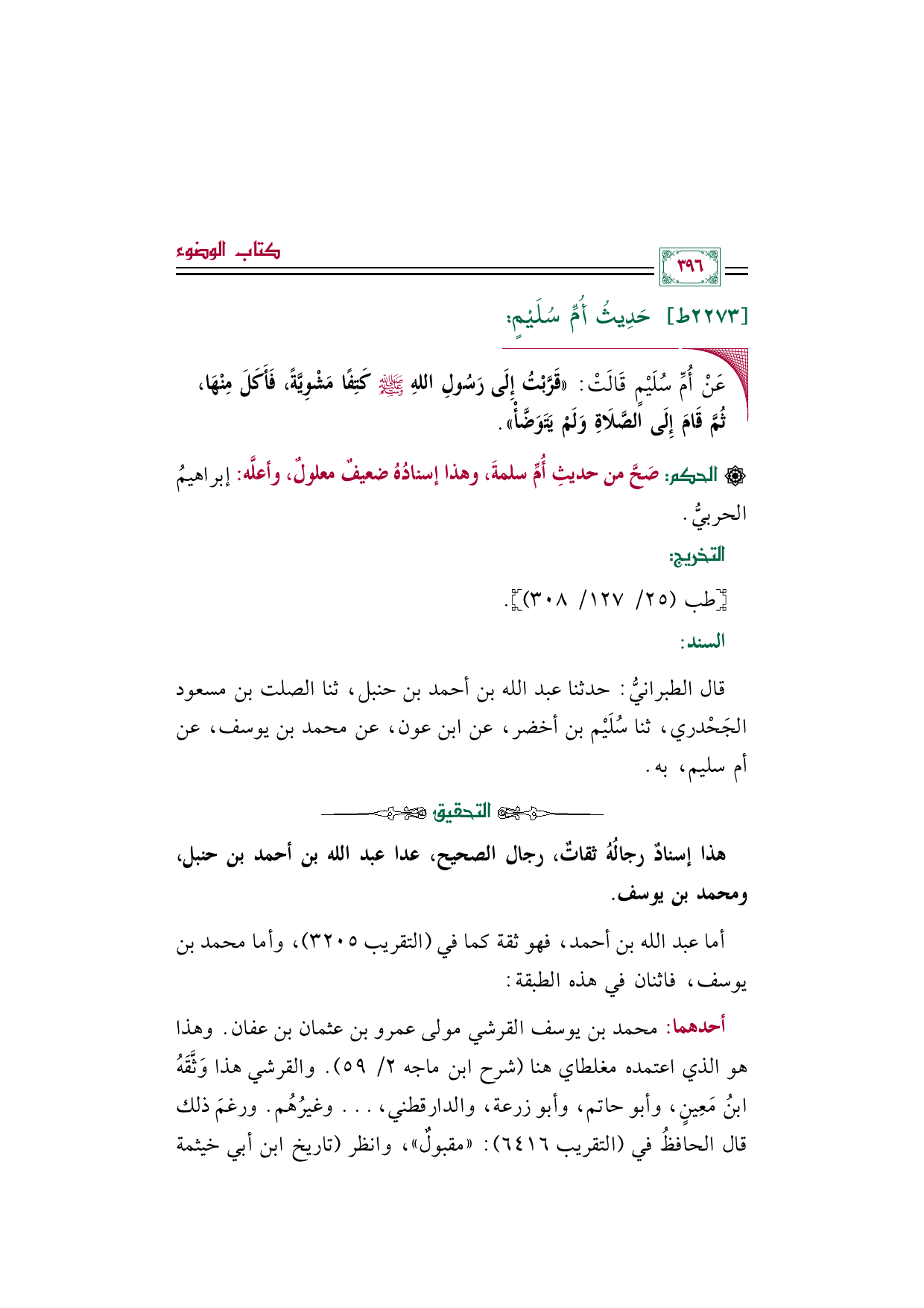 قال الطبرانيُّ: حدثنا عبد الله بن أحمد بن حنبل، ثنا الصلت بن مسعود الجَحْدري، ثنا سُلَيْم بن أخضر، عن ابن عون، عن محمد بن يوسف، عن أم سليم، به.