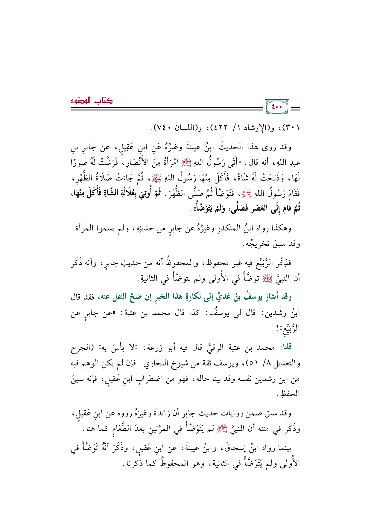 فذِكْر الرُّبَيِّع فيه غير محفوظ، والمحفوظُ أنه من حديثِ جابرٍ، وأنه ذَكَر أن النبيَّ صلى الله عليه وسلم توضَّأَ في الأُولى ولم يتوضَّأْ في الثانيةِ.