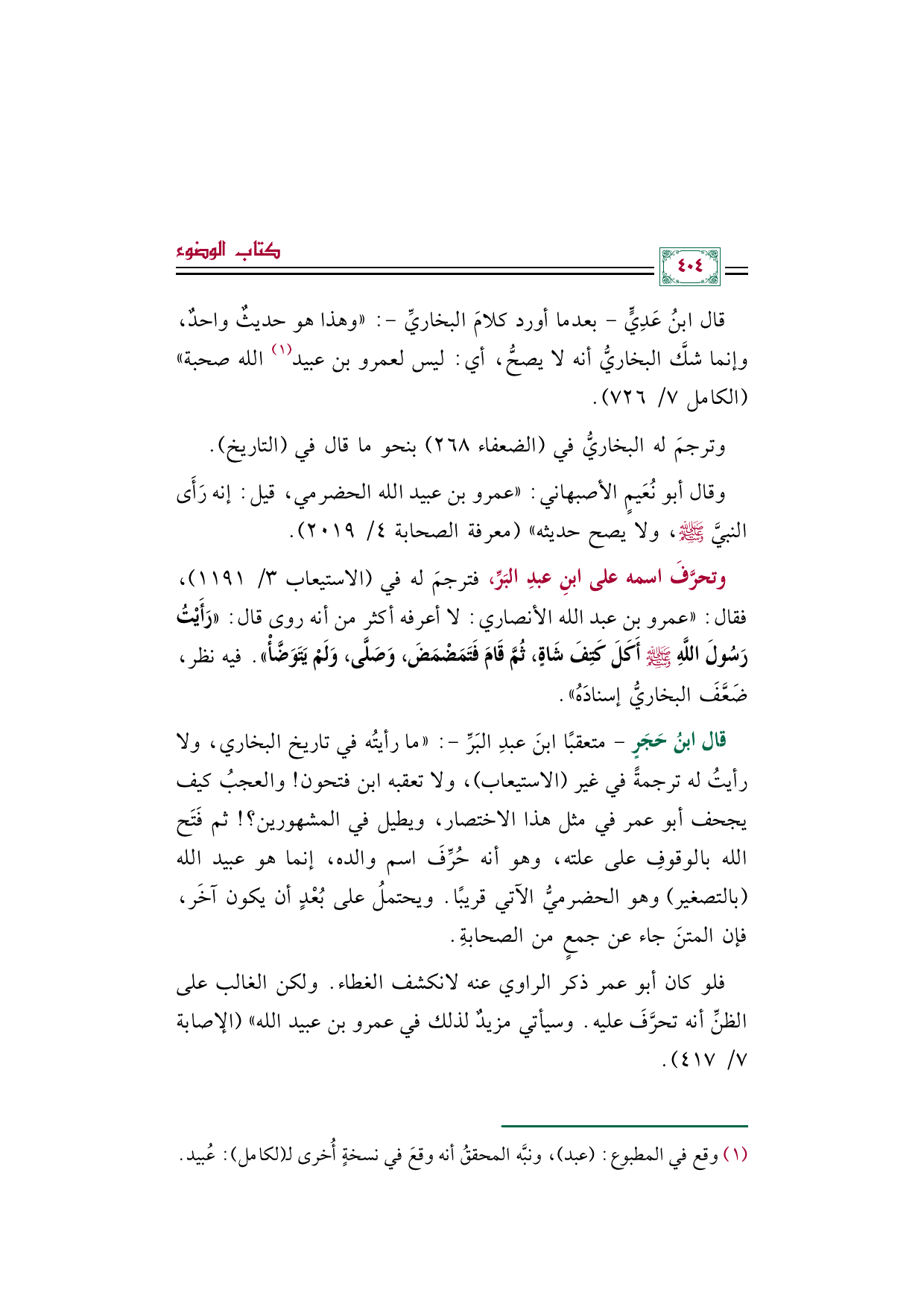 وتحرَّفَ اسمه على ابنِ عبدِ البَرِّ، فترجمَ له في (الاستيعاب ٣/ ١١٩١)، فقال: ((عمرو بن عبد الله الأنصاري: لا أعرفه أكثر من أنه روى قال: ((رَأَيْتُ رَسُولَ اللَّهِ صلى الله عليه وسلم أَكَلَ كَتِفَ شَاةٍ، ثُمَّ قَامَ فَتَمَضْمَضَ، وَصَلَّى، وَلَمْ يَتَوَضَّأْ)). فيه نظر، ضَعَّفَ البخاريُّ إسنادَهُ)).