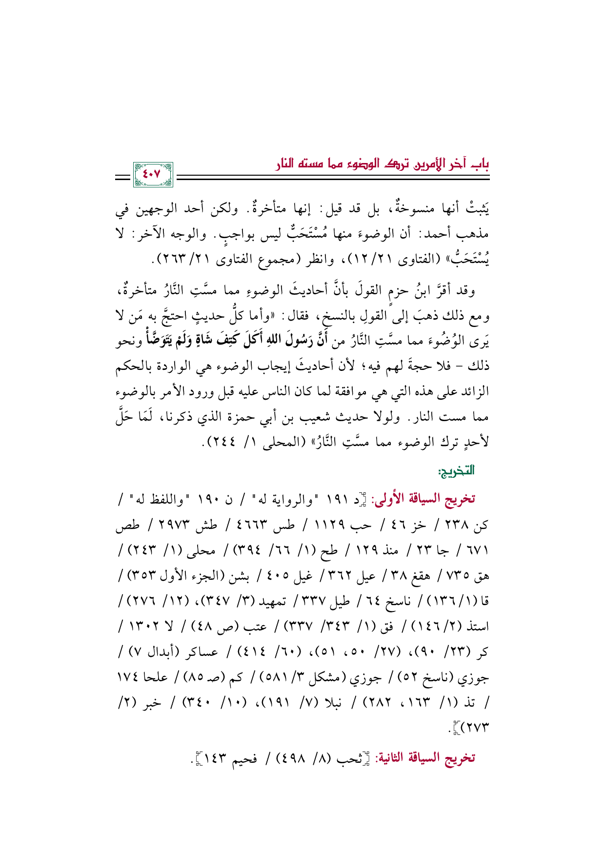 وقد أقرَّ ابنُ حزمٍ القولَ بأنَّ أحاديثَ الوضوءِ مما مسَّتِ النَّارُ متأخرةٌ، ومع ذلك ذهبَ إلى القولِ بالنسخِ، فقال: "وأما كلُّ حديثٍ احتجَّ به مَن لا يَرى الوُضُوءَ مما مسَّتِ النَّارُ من أَنَّ رَسُولَ اللهِ أَكَلَ كَتِفَ شَاةٍ وَلَمْ يَتَوَضَّأْ ونحو ذلك- فلا حجةَ لهم فيه؛ لأن أحاديثَ إيجاب الوضوء هي الواردة بالحكم الزائد على هذه التي هي موافقة لما كان الناس عليه قبل ورود الأمر بالوضوء مما مست النار. ولولا حديث شعيب بن أبي حمزة الذي ذكرنا، لَمَا حَلَّ لأحدٍ ترك الوضوء مما مسَّتِ النَّارُ" (المحلى ١/ ٢٤٤).