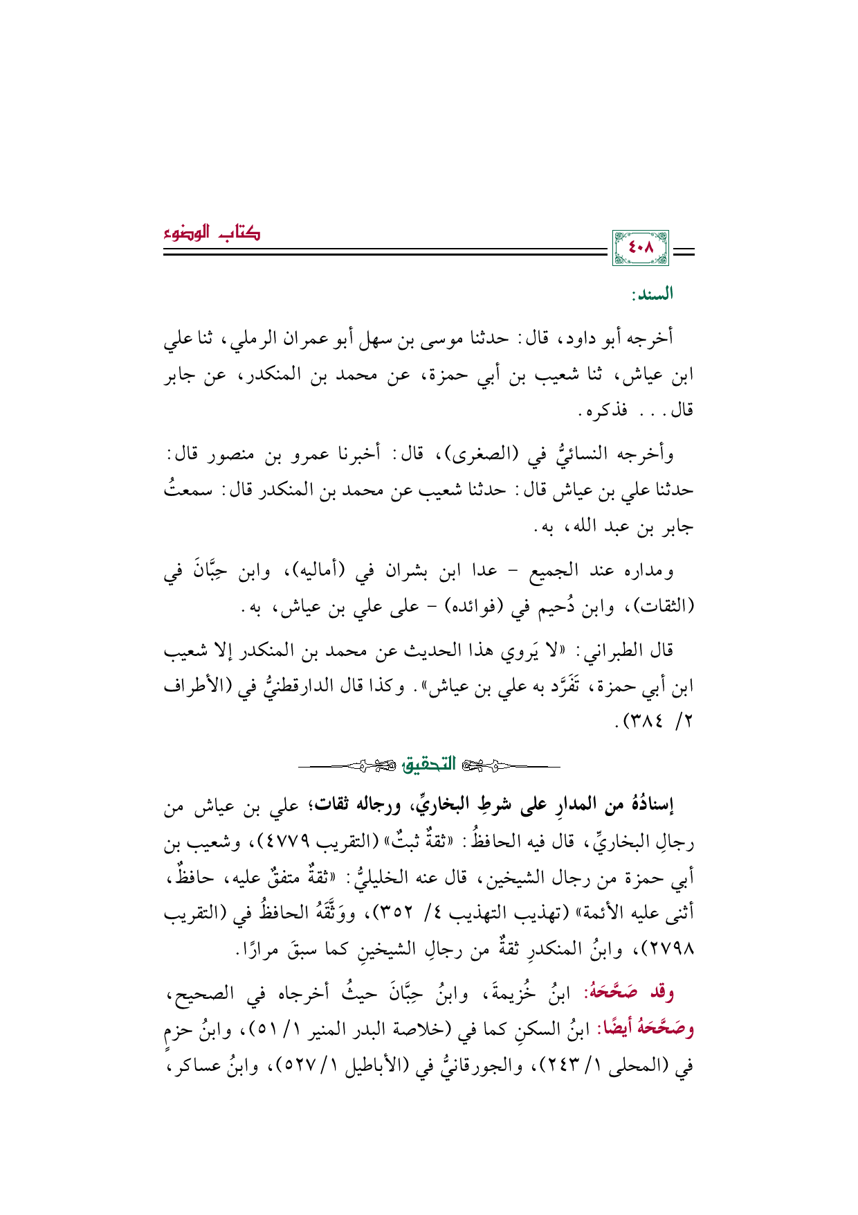 وقد صَحَّحَهُ: ابنُ خُزيمةَ، وابنُ حِبَّانَ حيثُ أخرجاه في الصحيح، وصَحَّحَهُ أيضًا: ابنُ السكنِ كما في (خلاصة البدر المنير ١/ ٥١)، وابنُ حزمٍ في (المحلى ١/ ٢٤٣)، والجورقانيُّ في (الأباطيل ١/ ٥٢٧)، وابنُ عساكر،