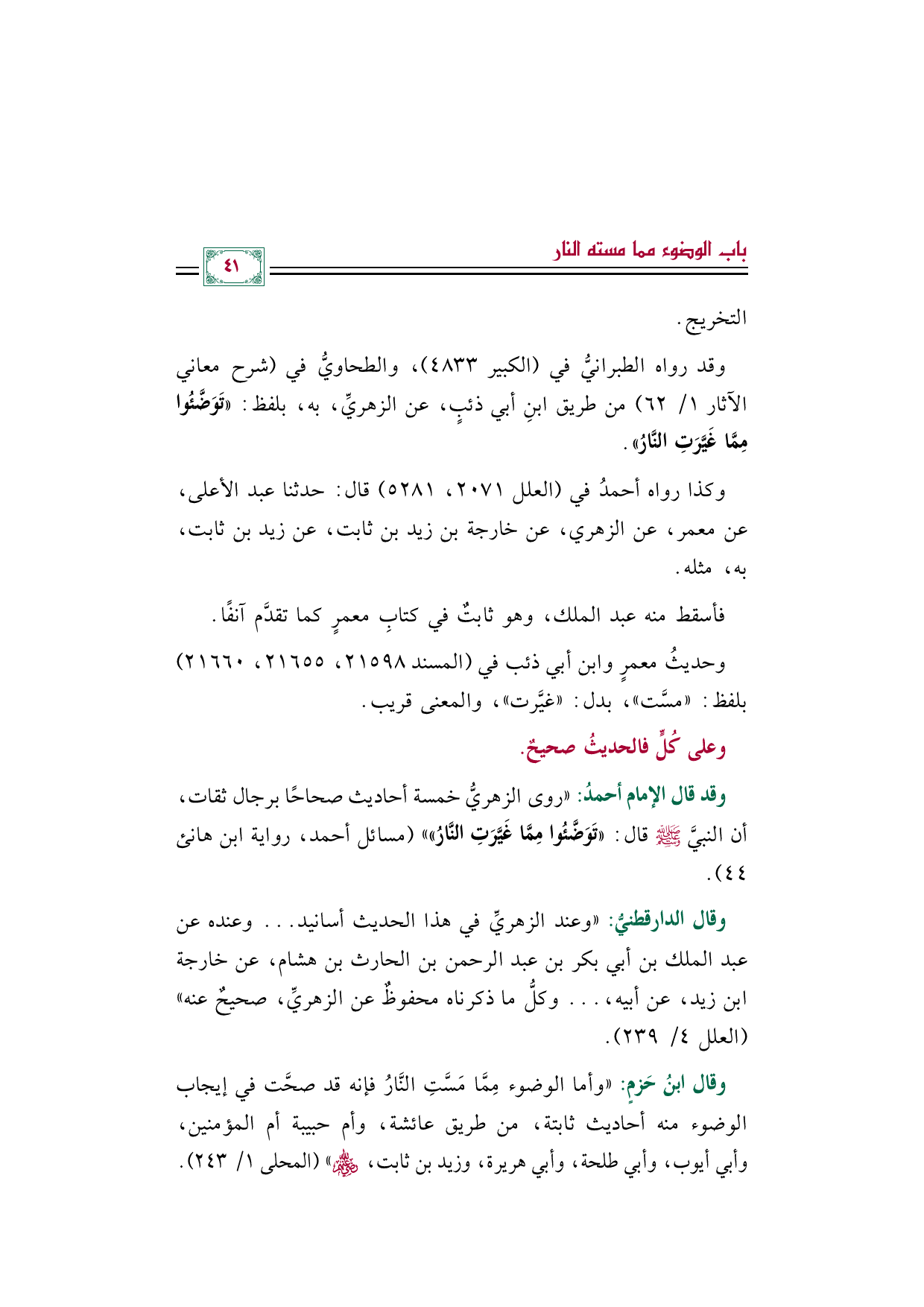 وقد قال الإمام أحمدُ: ((روى الزهريُّ خمسة أحاديث صحاحًا برجال ثقات، أن النبيَّ صلى الله عليه وسلم قال: ((تَوَضَّئُوا مِمَّا غَيَّرَتِ النَّارُ)))) (مسائل أحمد، رواية ابن هانئ ٤٤).