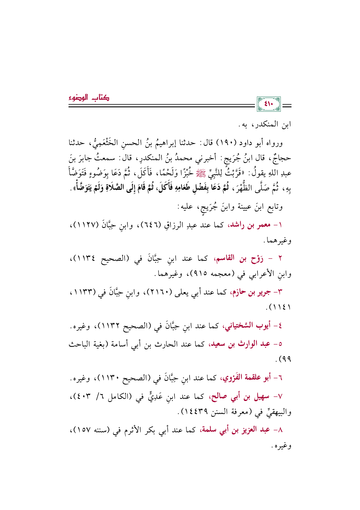 ورواه أبو داود (١٩٠) قال: حدثنا إبراهيمُ بنُ الحسنِ الخَثْعَمِيُّ، حدثنا حجاجٌ، قال ابنُ جُرَيجٍ: أخبرني محمدُ بنُ المنكدرِ، قال: سمعتُ جابرَ بنَ عبدِ اللهِ يقولُ: ((قَرَّبْتُ لِلنَّبِيِّ صلى الله عليه وسلم خُبْزًا وَلَحْمًا، فَأَكَلَ، ثُمَّ دَعَا بِوَضُوءٍ فَتَوَضَّأَ بِهِ، ثُمَّ صَلَّى الظُّهْرَ، ثُمَّ دَعَا بِفَضْلِ طَعَامِهِ فَأَكَلَ، ثُمَّ قَامَ إِلَى الصَّلَاةِ وَلَمْ يَتَوَضَّأْ)).