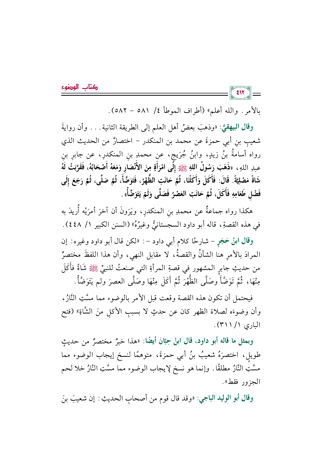 وقال البيهقيُّ: ((وذهبَ بعضُ أهل العلم إلى الطريقة الثانية ... وأن روايةَ شعيبِ بنِ أبي حمزةَ عن محمد بن المنكدر- اختصارٌ من الحديث الذي رواه أسامةُ بنُ زيدٍ، وابنُ جُرَيجٍ، عن محمدِ بنِ المنكدرِ، عن جابرِ بنِ عبدِ اللهِ، ((ذَهَبَ رَسُولُ اللهِ صلى الله عليه وسلم إِلَى امْرَأَةٍ مِنَ الأَنْصَارِ وَمَعَهُ أَصْحَابُهُ، فَقَرَّبَتْ لَهُ شَاةً مَصْلِيَّةً. قَالَ: فَأَكَلَ وَأَكَلْنَا، ثُمَّ حَانَتِ الظُّهْرُ، فَتَوَضَّأَ، ثُمَّ صَلَّى، ثُمَّ رَجَعَ إِلَى فَضْلِ طَعَامِهِ فَأَكَلَ، ثُمَّ حَانَتِ العَصْرُ فَصَلَّى وَلَمْ يَتَوَضَّأْ)).