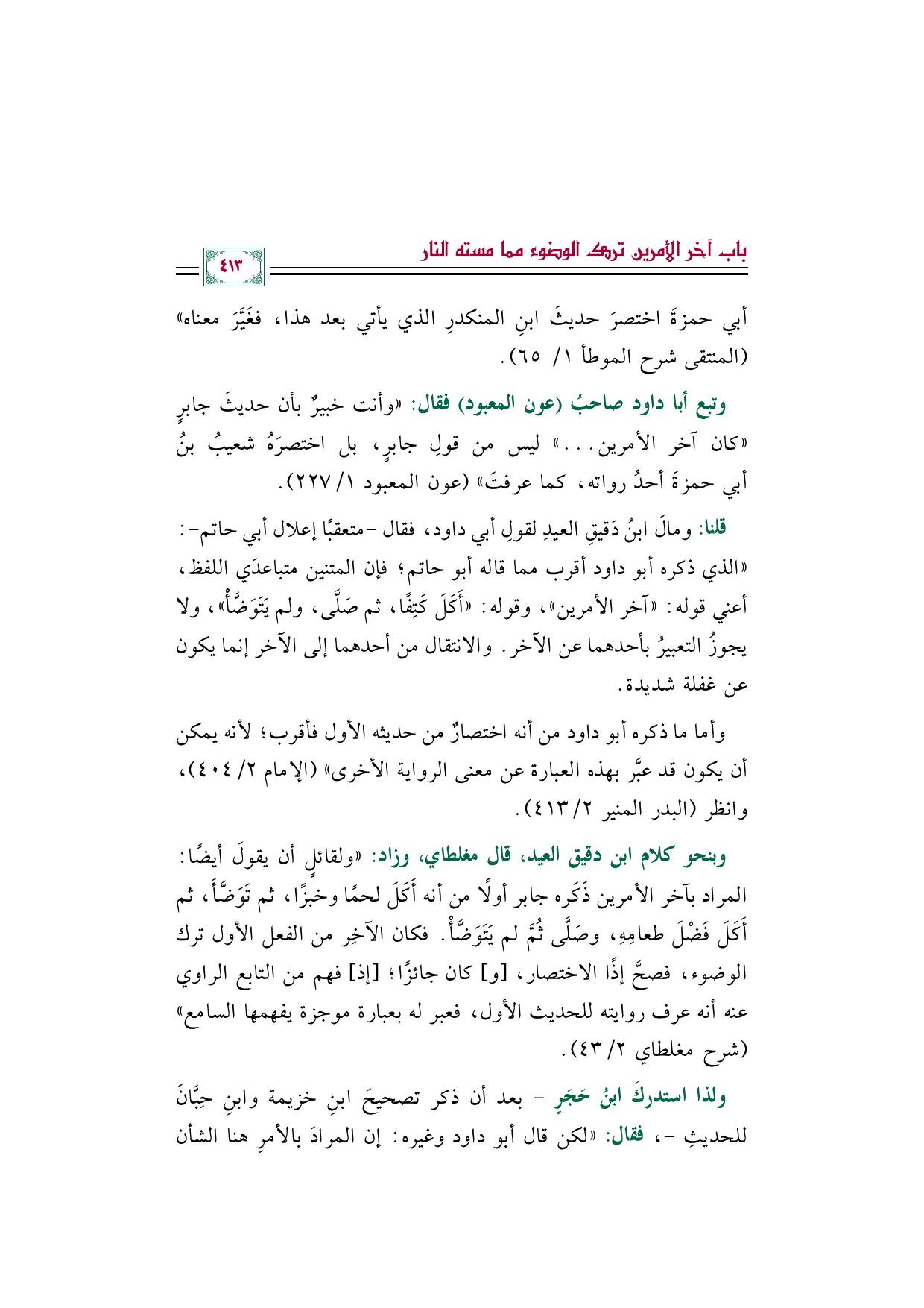 وتبع أبا داود صاحبُ (عون المعبود) فقال: ((وأنت خبيرٌ بأن حديثَ جابرٍ "كان آخر الأمرين ... " ليس من قولِ جابرٍ، بل اختصرَهُ شعيبُ بنُ أبي حمزةَ أحدُ رواته، كما عرفتَ)) (عون المعبود ١/ ٢٢٧).