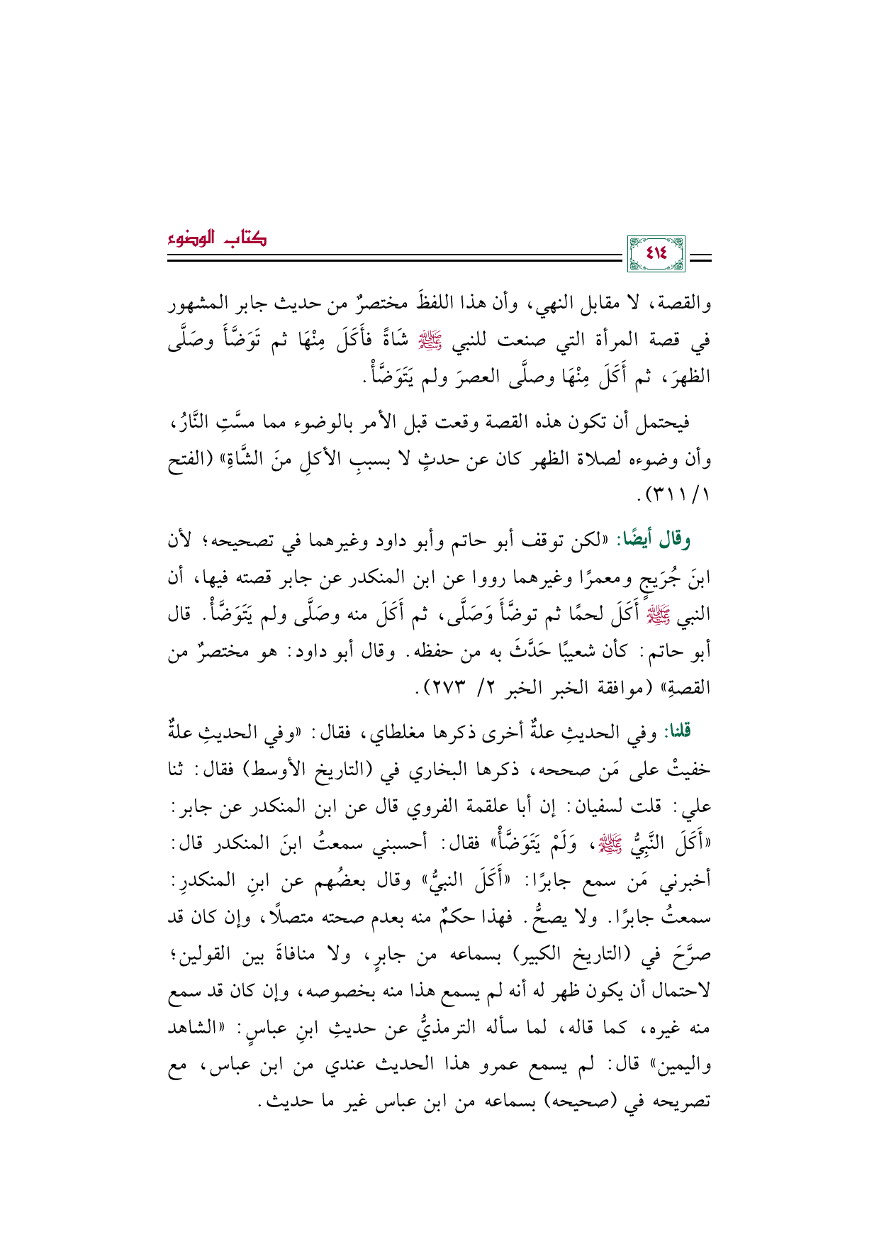 قلنا: وفي الحديثِ علةٌ أخرى ذكرها مغلطاي، فقال: ((وفي الحديثِ علةٌ خفيتْ على مَن صححه، ذكرها البخاري في (التاريخ الأوسط) فقال: ثنا علي: قلت لسفيان: إن أبا علقمة الفروي قال عن ابن المنكدر عن جابر: " أَكَلَ النَّبِيُّ صلى الله عليه وسلم، وَلَمْ يَتَوَضَّأْ" فقال: أحسبني سمعتُ ابنَ المنكدر قال: أخبرني مَن سمع جابرًا: "أَكَلَ النبيُّ" وقال بعضُهم عن ابنِ المنكدرِ: سمعتُ جابرًا. ولا يصحُّ. فهذا حكمٌ منه بعدم صحته متصلًا، وإن كان قد صرَّحَ في (التاريخ الكبير) بسماعه من جابرٍ، ولا منافاةَ بين القولين؛ لاحتمال أن يكون ظهر له أنه لم يسمع هذا منه بخصوصه، وإن كان قد سمع منه غيره، كما قاله، لما سأله الترمذيُّ عن حديثِ ابنِ عباسٍ: "الشاهد واليمين" قال: لم يسمع عمرو هذا الحديث عندي من ابن عباس، مع تصريحه في (صحيحه) بسماعه من ابن عباس غير ما حديث.