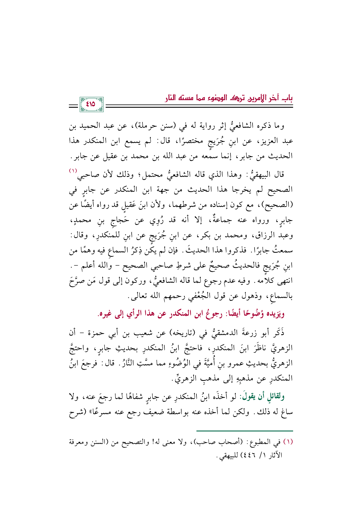 ولقائلٍ أن يقولَ: لو أخذَه ابنُ المنكدرِ عن جابرٍ شفاهًا لما رجعَ عنه، ولا ساغ له ذلك. ولكن لما أخذه عنه بواسطة ضعيف رجع عنه مسرعًا)) (شرح