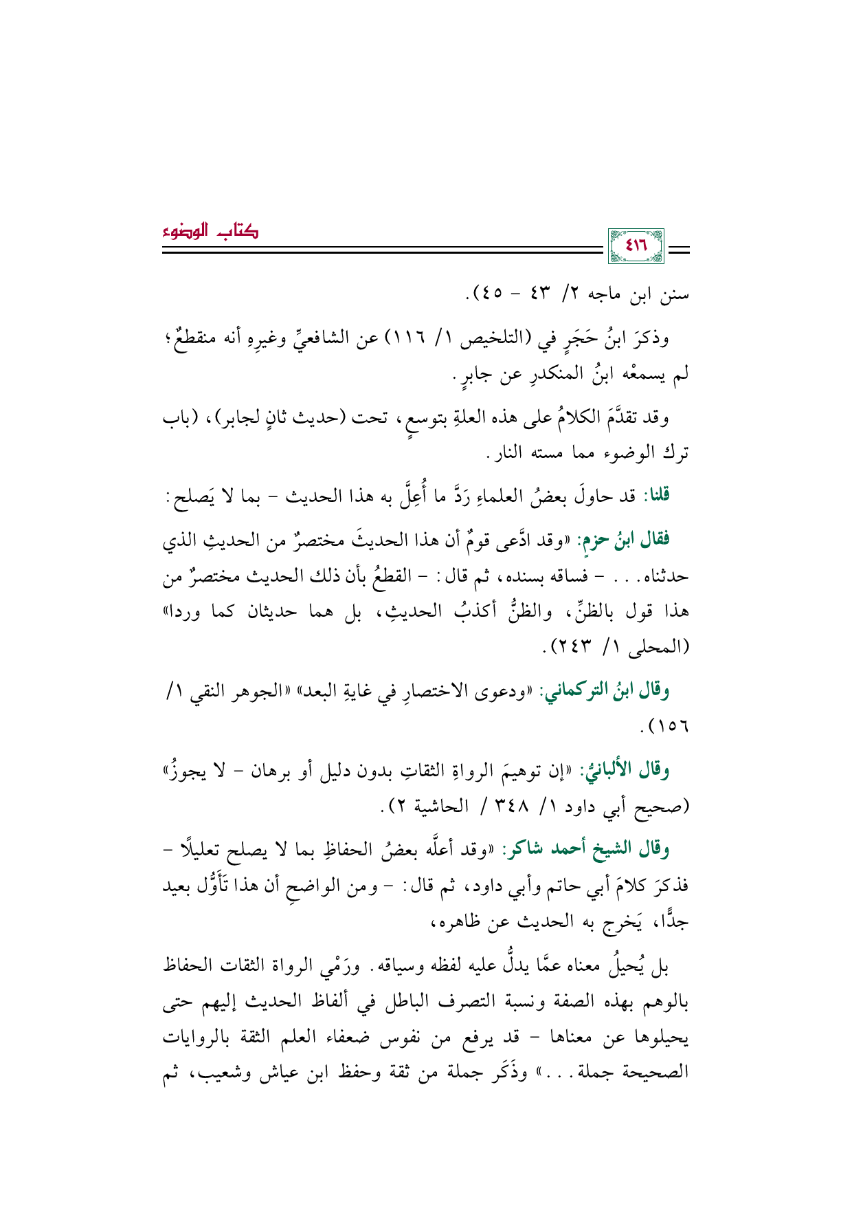 وذكرَ ابنُ حَجَرٍ في (التلخيص ١/ ١١٦) عن الشافعيِّ وغيرِهِ أنه منقطعٌ؛ لم يسمعْه ابنُ المنكدرِ عن جابرٍ.