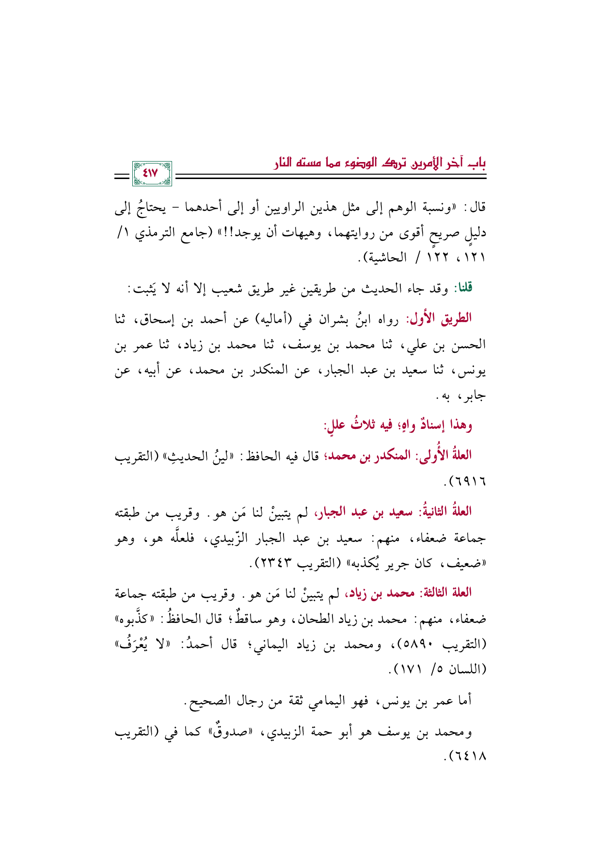 قال: ((ونسبة الوهم إلى مثل هذين الراويين أو إلى أحدهما- يحتاجُ إلى دليلٍ صريحٍ أقوى من روايتهما، وهيهات أن يوجد! ! )) (جامع الترمذي ١/ ١٢١، ١٢٢/ الحاشية).
