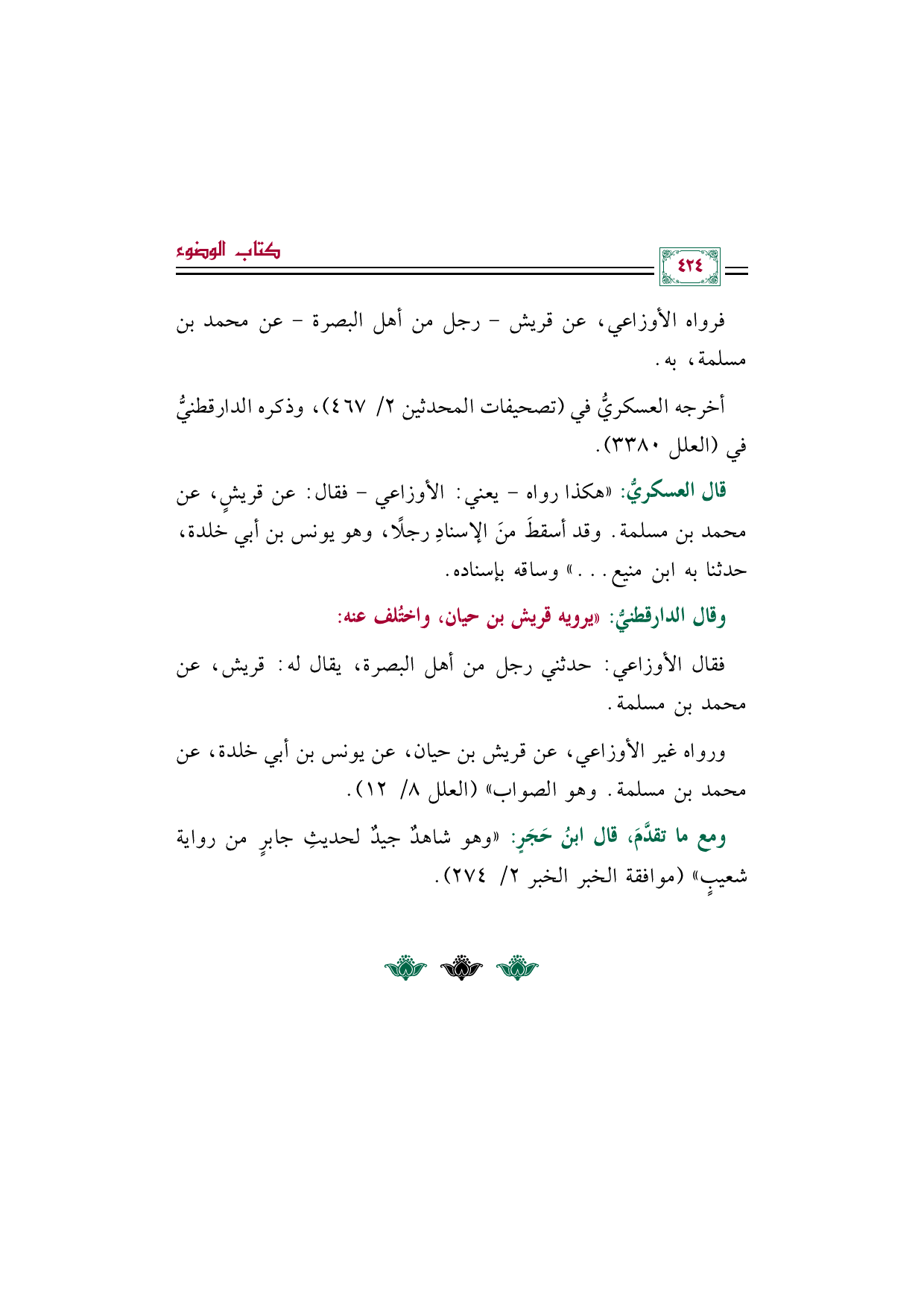 قال العسكريُّ: ((هكذا رواه -يعني: الأوزاعي- فقال: عن قريشٍ، عن محمد بن مسلمة. وقد أسقطَ منَ الإسنادِ رجلًا، وهو يونس بن أبي خلدة، حدثنا به ابن منيع ... )) وساقه بإسناده.