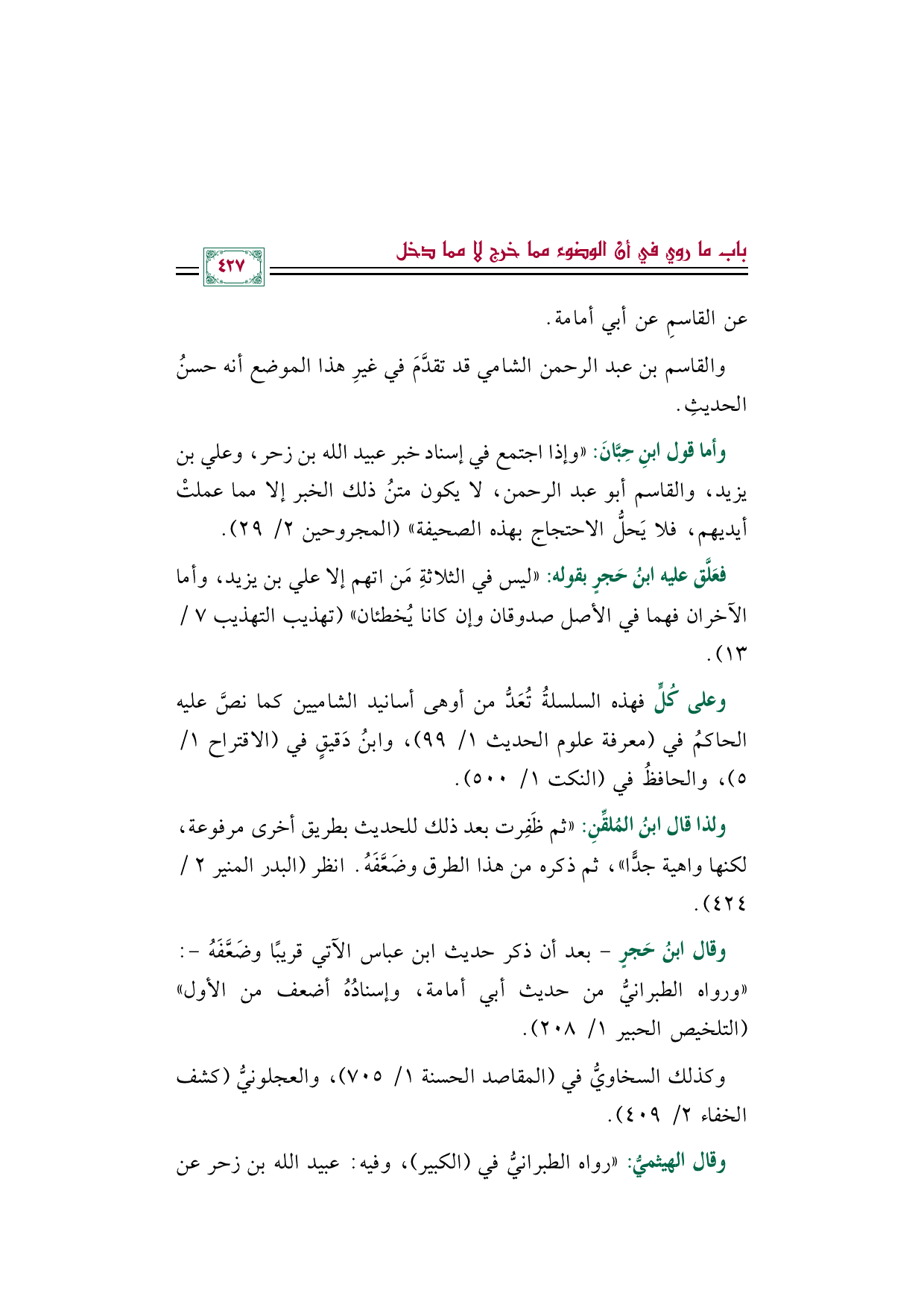 وأما قول ابنِ حِبَّانَ: "وإذا اجتمع في إسناد خبر عبيد الله بن زحر، وعلي بن يزيد، والقاسم أبو عبد الرحمن، لا يكون متنُ ذلك الخبر إلا مما عملتْ أيديهم، فلا يَحلُّ الاحتجاج بهذه الصحيفة" (المجروحين ٢/ ٢٩).
