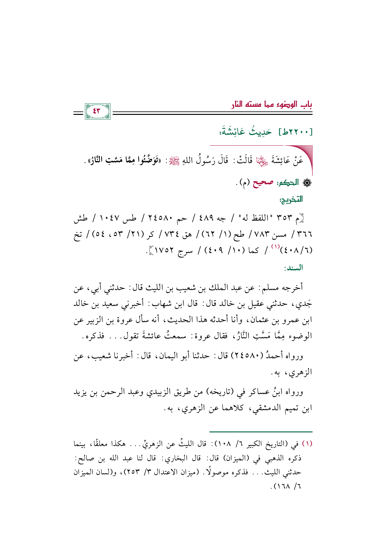 أخرجه مسلم: عن عبد الملك بن شعيب بن الليث قال: حدثني أبي، عن جَدي، حدثني عقيل بن خالد قال: قال ابن شهاب: أخبرني سعيد بن خالد بن عمرو بن عثمان، وأنا أحدثه هذا الحديث، أنه سأل عروة بن الزبير عن الوضوء مِمَّا مَسَّتِ النَّارُ، فقال عروة: سمعتُ عائشةَ تقول ... فذكره.