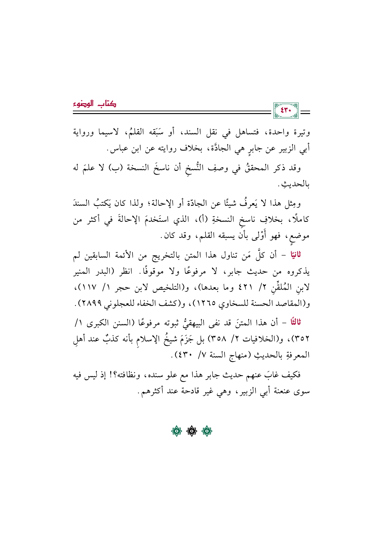 ومِثل هذا لا يَعرفُ شيئًا عن الجادّة أو الإحالة؛ ولذا كان يَكتبُ السندَ كاملًا، بخلافِ ناسخِ النسخةِ (أ)، الذي استَخدمَ الإحالةَ في أكثر من موضعٍ، فهو أَوْلى بأن يسبقه القلم، وقد كان.