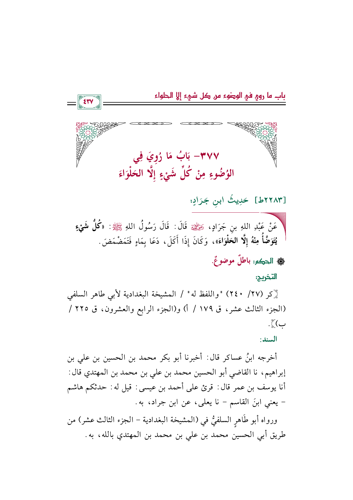 ◼ عَنْ عَبْدِ اللهِ بنِ جَرَادٍ، رضي الله عنه قَالَ: قَالَ رَسُولُ اللهِ صلى الله عليه وسلم: ((كُلُّ شَيْءٍ يُتَوَضَّأُ مِنْهُ إِلَّا الحَلْوَاءَ))، وَكَانَ إِذَا أَكَلَ، دَعَا بِمَاءٍ فَتَمَضْمَضَ.