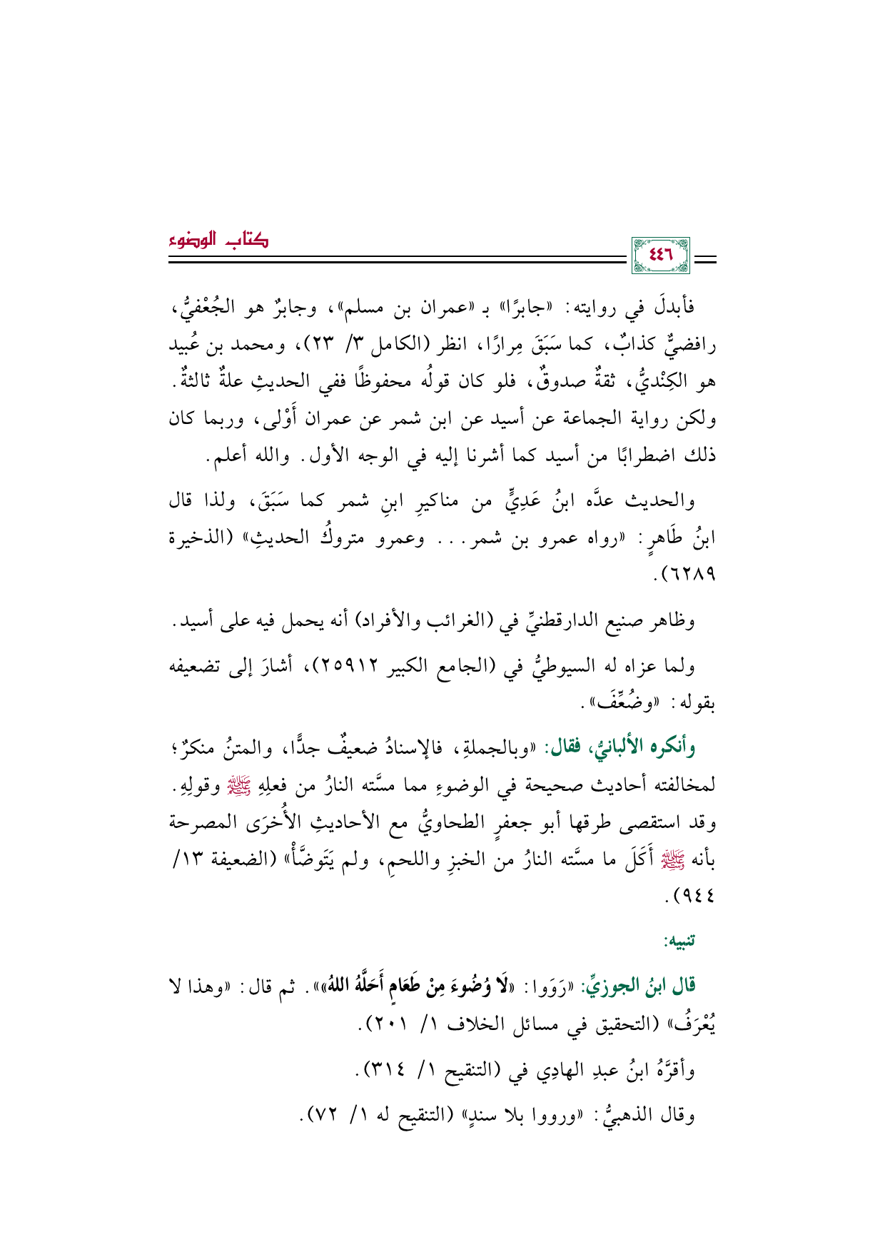 وأنكره الألبانيُّ، فقال: "وبالجملةِ، فالإسنادُ ضعيفٌ جدًّا، والمتنُ منكرٌ؛ لمخالفته أحاديث صحيحة في الوضوءِ مما مسَّته النارُ من فعلِهِ صلى الله عليه وسلم وقولِهِ. وقد استقصى طرقها أبو جعفرٍ الطحاويُّ مع الأحاديثِ الأُخرَى المصرحة بأنه صلى الله عليه وسلم أَكَلَ ما مسَّته النارُ من الخبزِ واللحمِ، ولم يَتَوضَّأْ" (الضعيفة ١٣/ ٩٤٤).