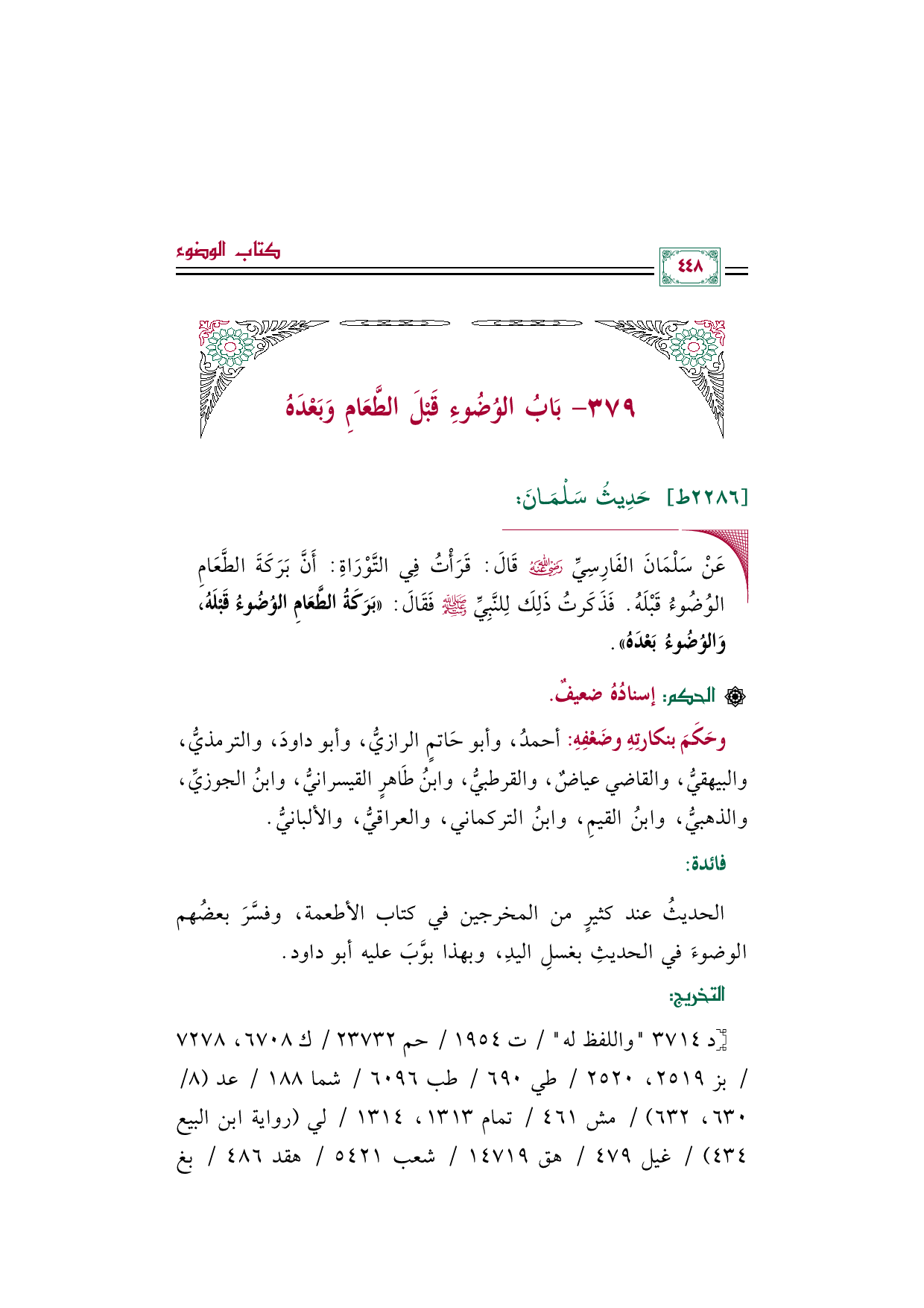 ٣٧٩ - بَابُ الوُضُوءِ قَبْلَ الطَّعَامِ وَبَعْدَهُ