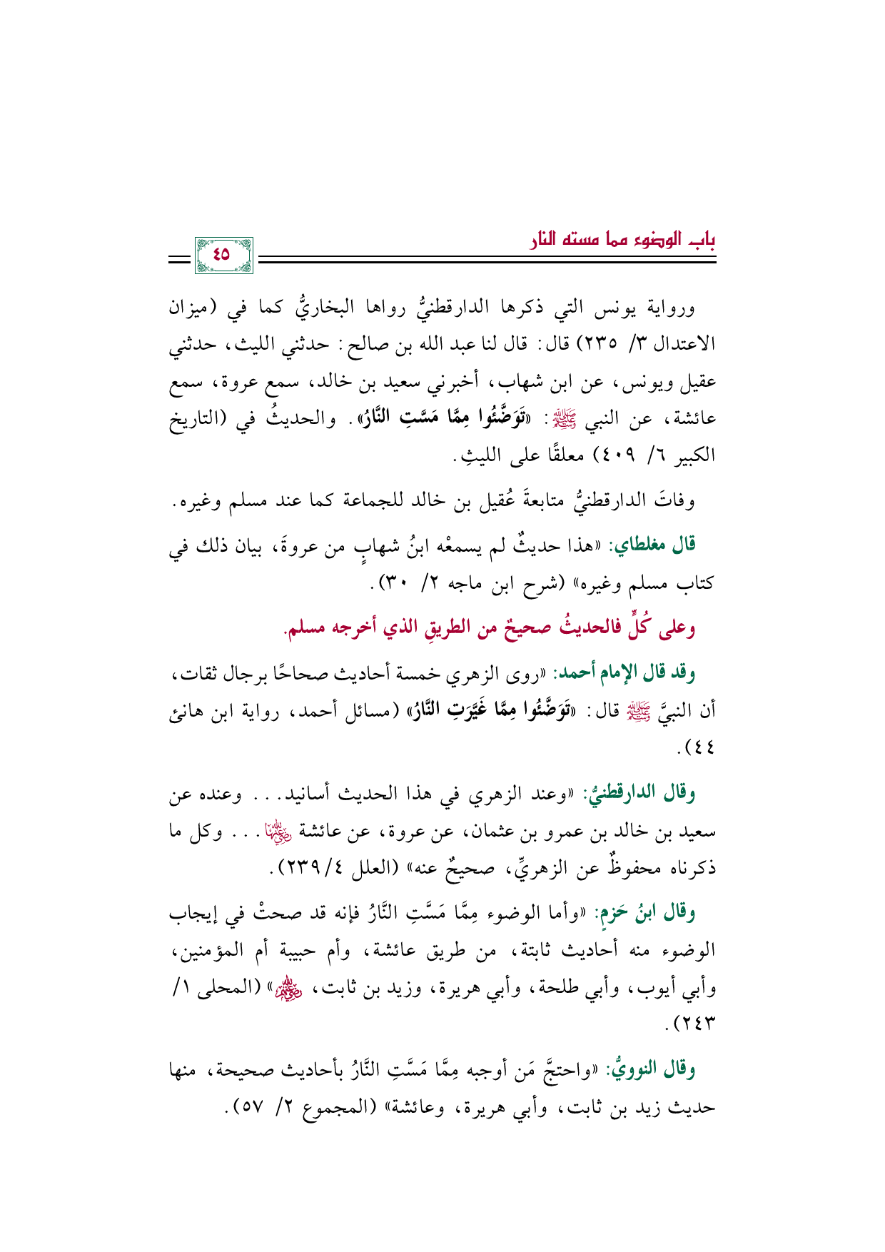 وقال ابنُ حَزمٍ: ((وأما الوضوء مِمَّا مَسَّتِ النَّارُ فإنه قد صحتْ في إيجاب الوضوء منه أحاديث ثابتة، من طريق عائشة، وأم حبيبة أم المؤمنين، وأبي أيوب، وأبي طلحة، وأبي هريرة، وزيد بن ثابت، رضي الله عنهم)) (المحلى ١/ ٢٤٣).