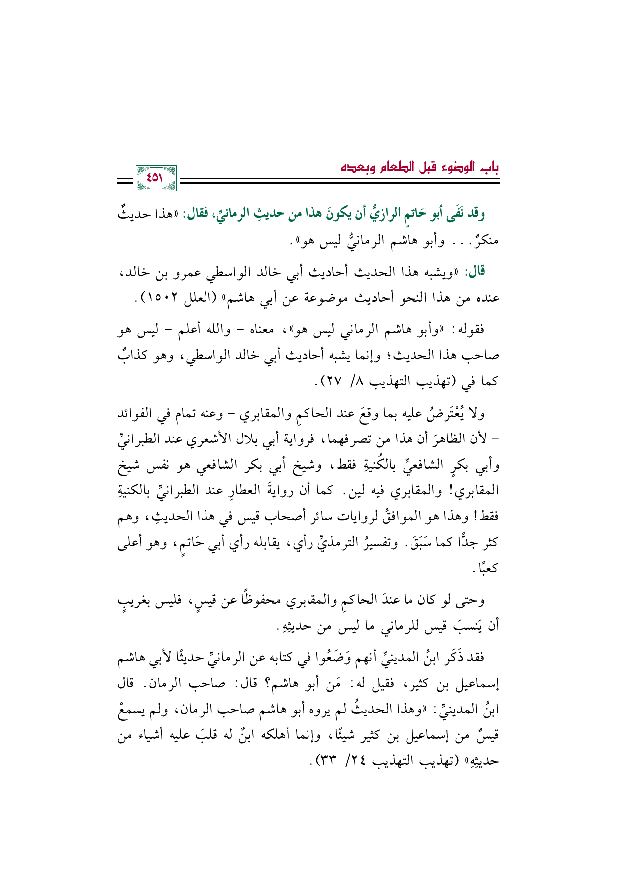 وقد نَفَى أبو حَاتمٍ الرازيُّ أن يكونَ هذا من حديثِ الرمانيِّ، فقال: "هذا حديثٌ منكرٌ ... وأبو هاشم الرمانيُّ ليس هو".