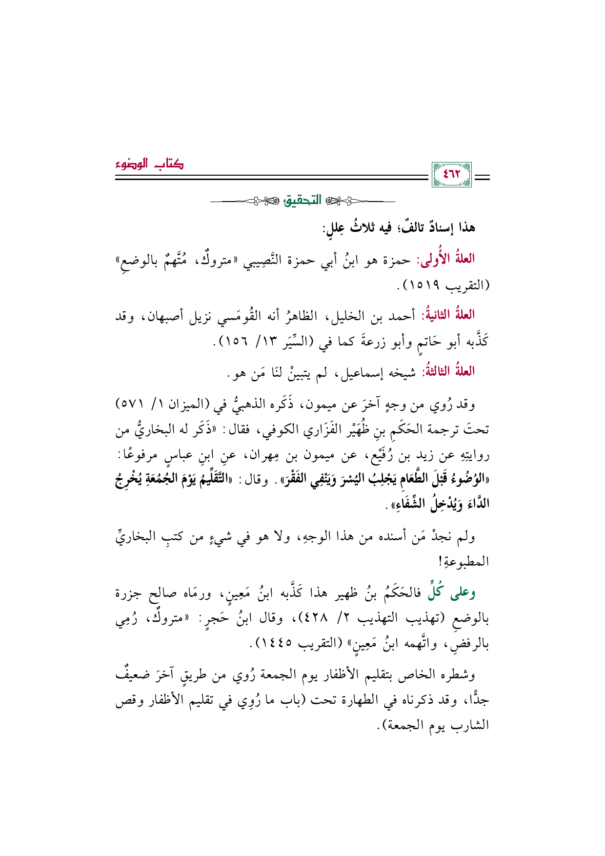 وعلى كُلٍّ فالحَكَمُ بنُ ظهير هذا كَذَّبه ابنُ مَعِينٍ، ورمَاه صالح جزرة بالوضعِ (تهذيب التهذيب ٢/ ٤٢٨)، وقال ابنُ حَجرٍ: "متروكٌ، رُمِي بالرفضِ، واتَّهمه ابنُ مَعِينٍ" (التقريب ١٤٤٥).