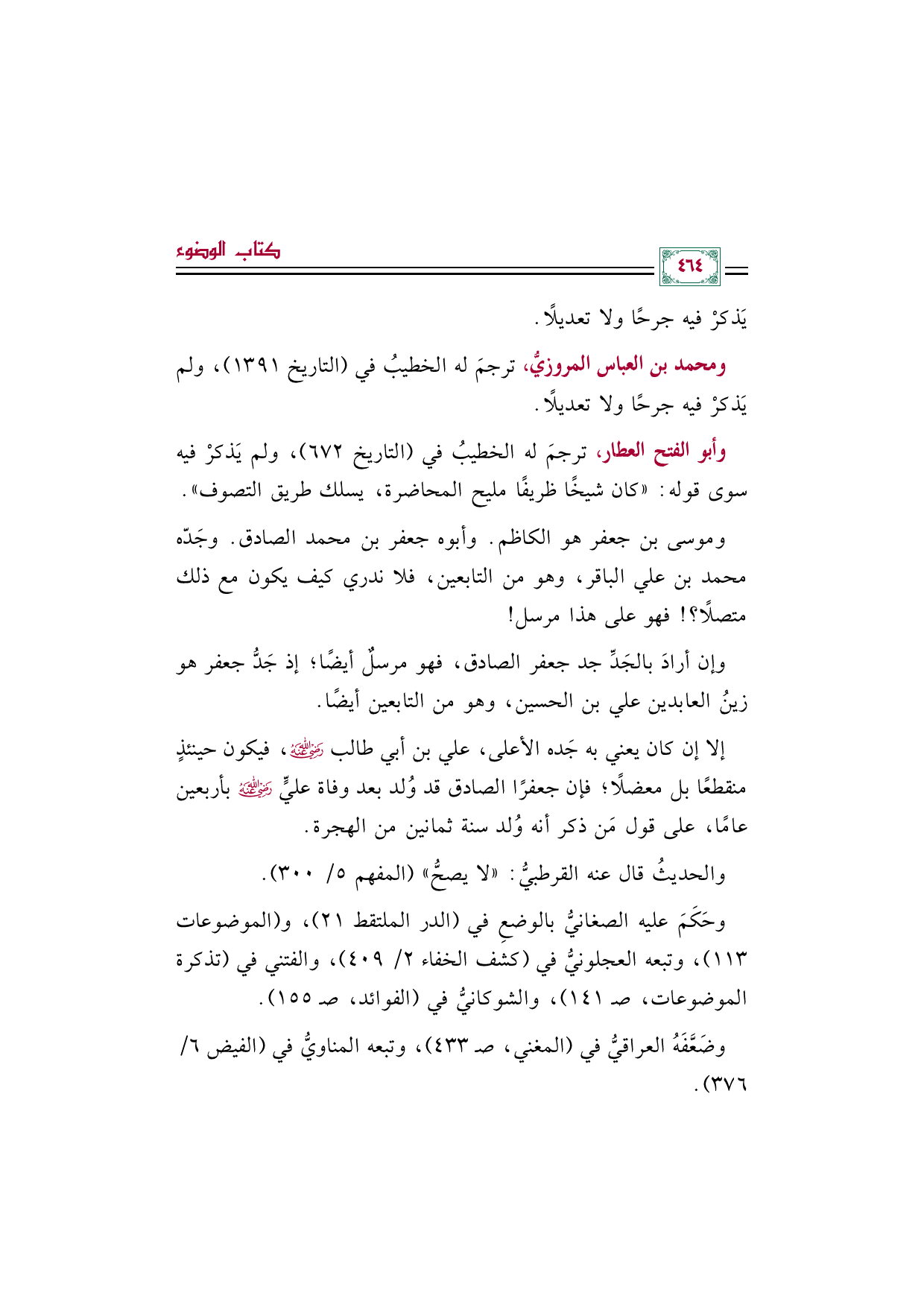إلا إن كان يعني به جَده الأعلى، علي بن أبي طالب رضي الله عنه، فيكون حينئذٍ منقطعًا بل معضلًا؛ فإن جعفرًا الصادق قد وُلد بعد وفاة عليٍّ رضي الله عنه بأربعين عامًا، على قول مَن ذكر أنه وُلد سنة ثمانين من الهجرة.
