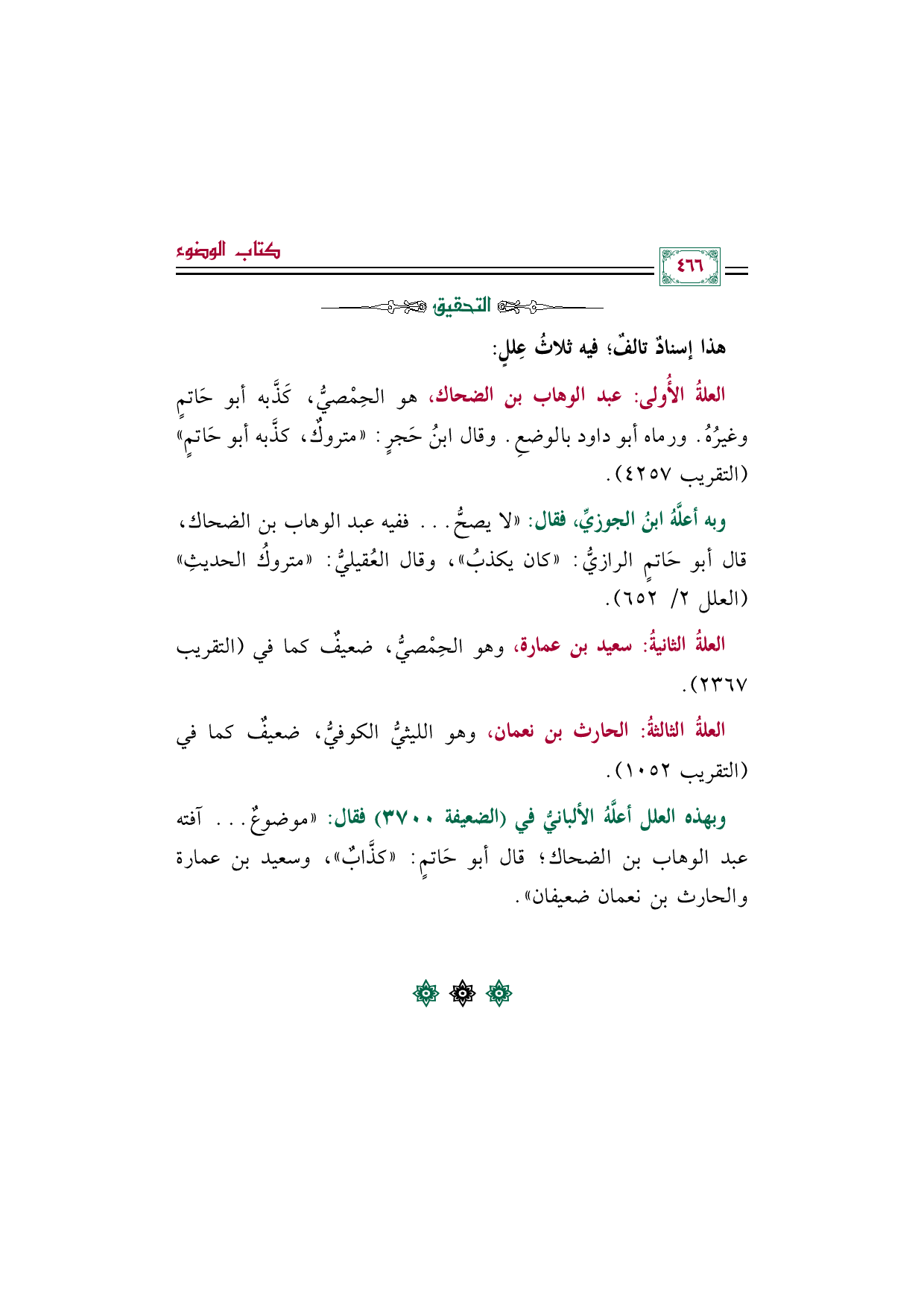 وبهذه العلل أعلَّهُ الألبانيُّ في (الضعيفة ٣٧٠٠) فقال: "موضوعٌ ... آفته عبد الوهاب بن الضحاك؛ قال أبو حَاتمٍ: "كذَّابٌ"، وسعيد بن عمارة والحارث بن نعمان ضعيفان".
