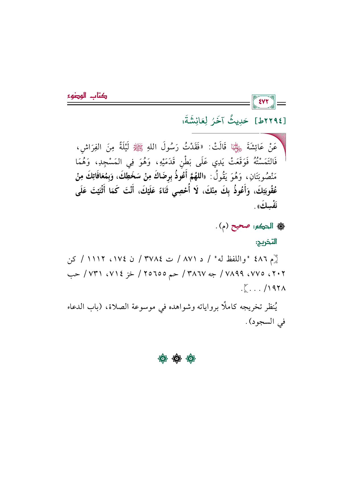 ◼ عَنْ عَائِشَةَ رضي الله عنها قَالَتْ: ((فَقَدْتُ رَسُولَ اللهِ صلى الله عليه وسلم لَيْلَةً مِنَ الفِرَاشِ، فَالتَمَسْتُهُ فَوَقَعَتْ يَدِي عَلَى بَطْنِ قَدَمَيْهِ، وَهُوَ فِي المَسْجِدِ، وَهُمَا مَنْصُوبَتَانِ، وَهُوَ يَقُولُ: ((اللهُمَّ أَعُوذُ بِرِضَاكَ مِنْ سَخَطِكَ، وَبِمُعَافَاتِكَ مِنْ عُقُوبَتِكَ، وَأَعُوذُ بِكَ مِنْكَ، لَا أُحْصِي ثَنَاءً عَلَيْكَ، أَنْتَ كَمَا أَثْنَيْتَ عَلَى نَفْسِكَ)).