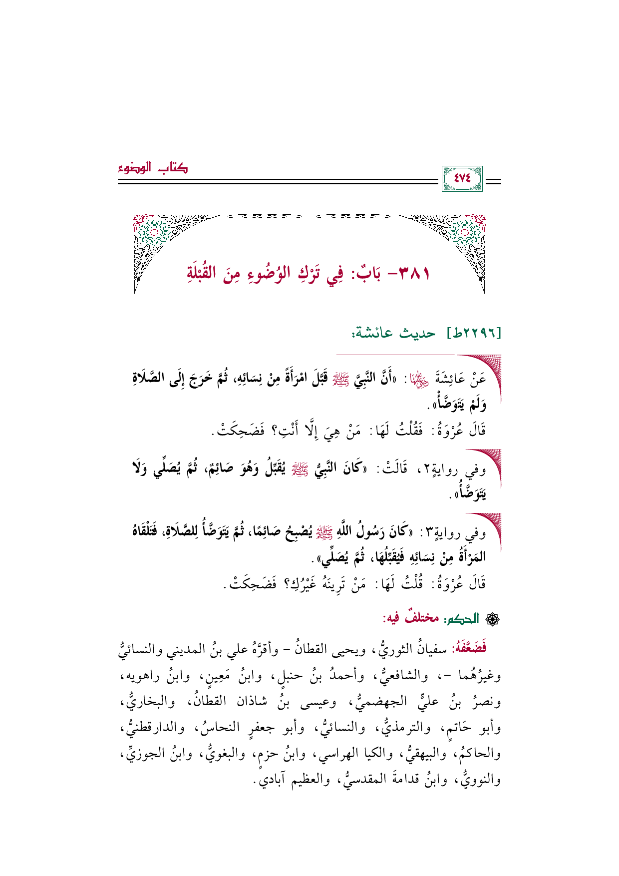 ◼ عَنْ عَائِشَةَ رضي الله عنها: ((أَنَّ النَّبِيَّ صلى الله عليه وسلم قَبَّلَ امْرَأَةً مِنْ نِسَائِهِ، ثُمَّ خَرَجَ إِلَى الصَّلَاةِ وَلَمْ يَتَوَضَّأْ)).
