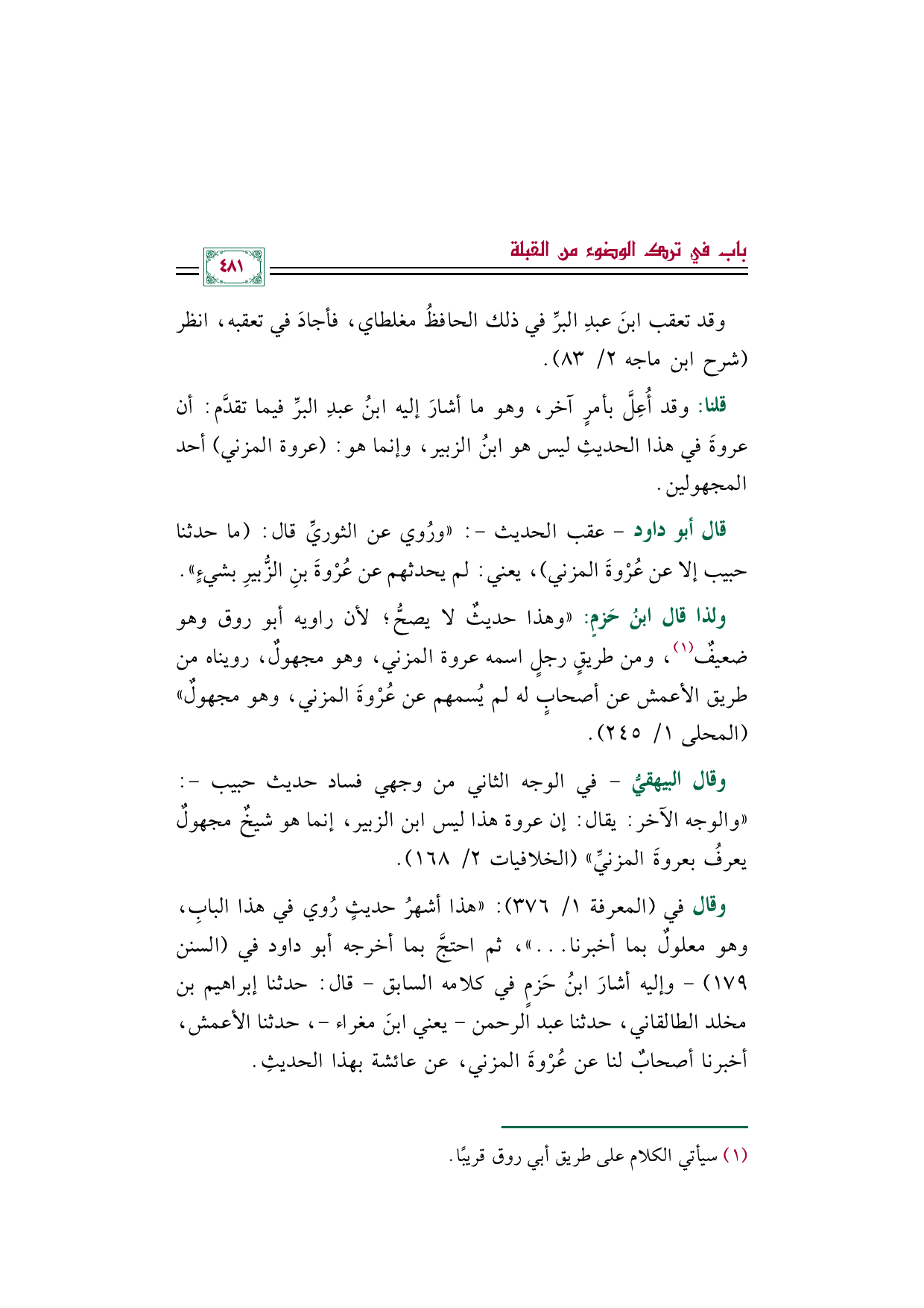 وقال في (المعرفة ١/ ٣٧٦): "هذا أشهرُ حديثٍ رُوي في هذا البابِ، وهو معلولٌ بما أخبرنا ... "، ثم احتجَّ بما أخرجه أبو داود في (السنن ١٧٩) -وإليه أشارَ ابنُ حَزمٍ في كلامه السابق- قال: حدثنا إبراهيم بن مخلد الطالقاني، حدثنا عبد الرحمن -يعني ابنَ مغراء-، حدثنا الأعمش، أخبرنا أصحابٌ لنا عن عُرْوةَ المزني، عن عائشة بهذا الحديثِ.