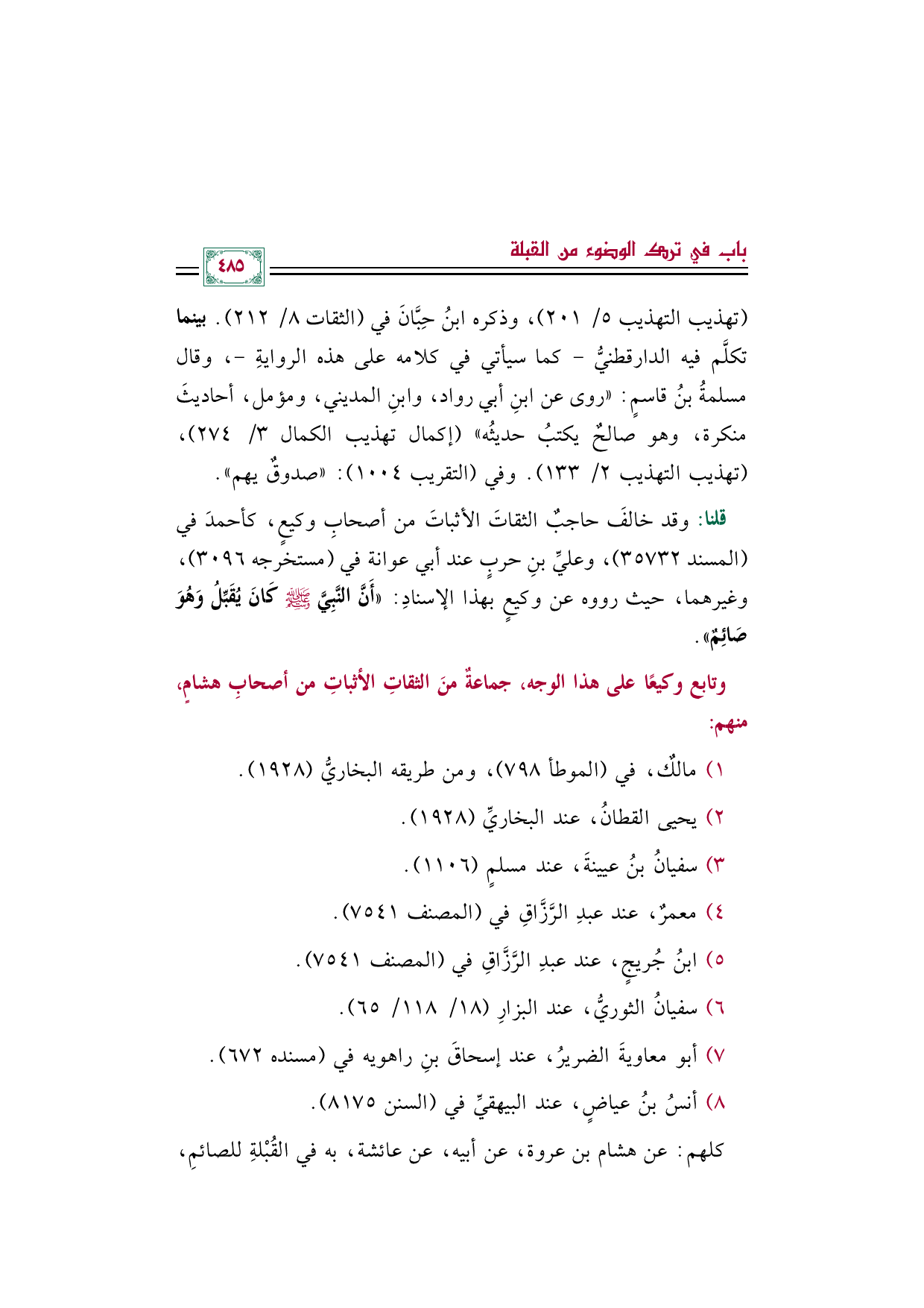 قلنا: وقد خالفَ حاجبٌ الثقاتَ الأثباتَ من أصحابِ وكيعٍ، كأحمدَ في (المسند ٣٥٧٣٢)، وعليِّ بنِ حربٍ عند أبي عوانة في (مستخرجه ٣٠٩٦)، وغيرهما، حيث رووه عن وكيعٍ بهذا الإسنادِ: ((أَنَّ النَّبِيَّ صلى الله عليه وسلم كَانَ يُقَبِّلُ وَهُوَ صَائِمٌ)).