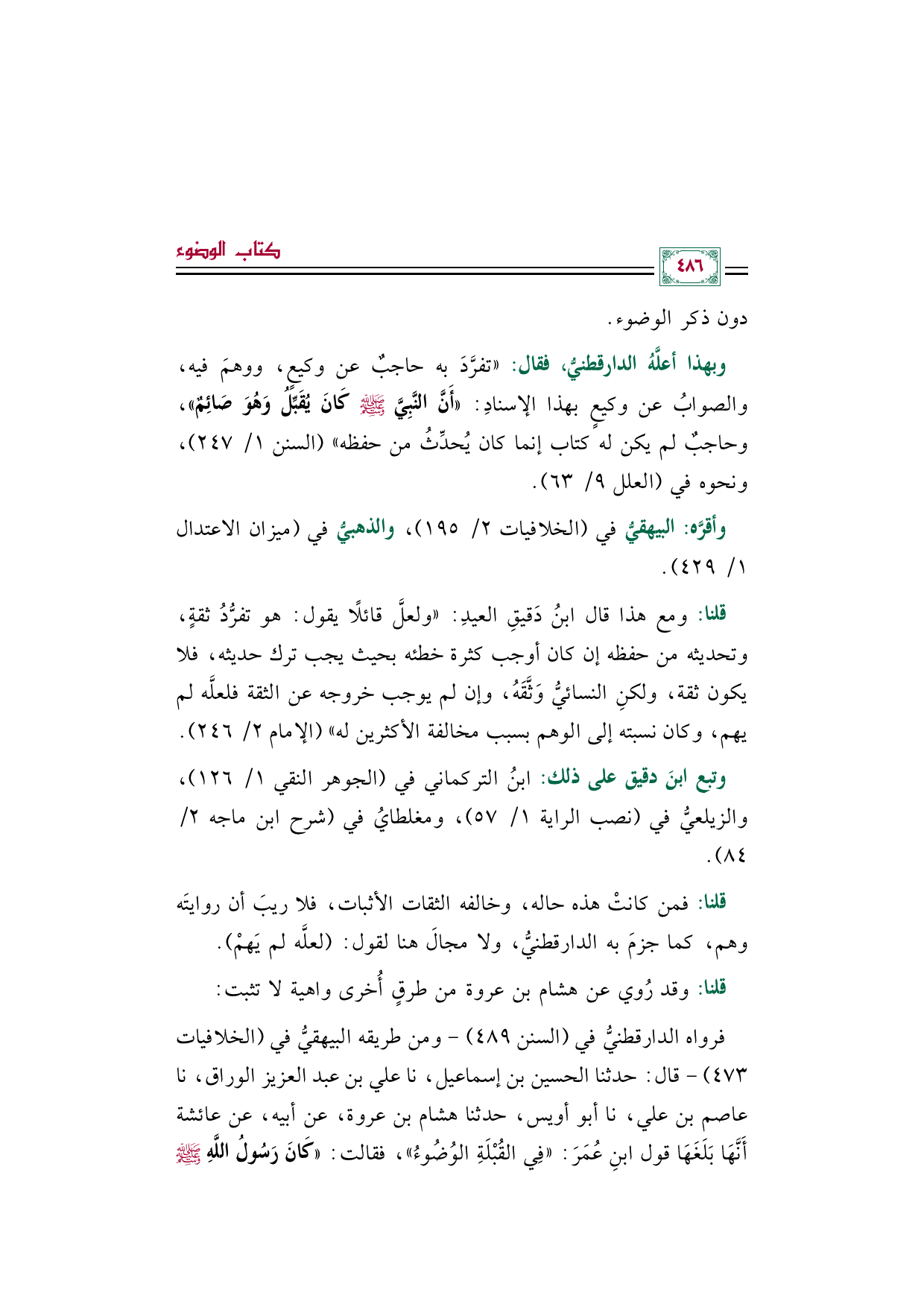 فرواه الدارقطنيُّ في (السنن ٤٨٩) -ومن طريقه البيهقيُّ في (الخلافيات ٤٧٣) - قال: حدثنا الحسين بن إسماعيل، نا علي بن عبد العزيز الوراق، نا عاصم بن علي، نا أبو أويس، حدثنا هشام بن عروة، عن أبيه، عن عائشة أَنَّهَا بَلَغَهَا قول ابنِ عُمَرَ: ((فِي القُبْلَةِ الوُضُوءُ))، فقالت: ((كَانَ رَسُولُ اللَّهِ صلى الله عليه وسلم