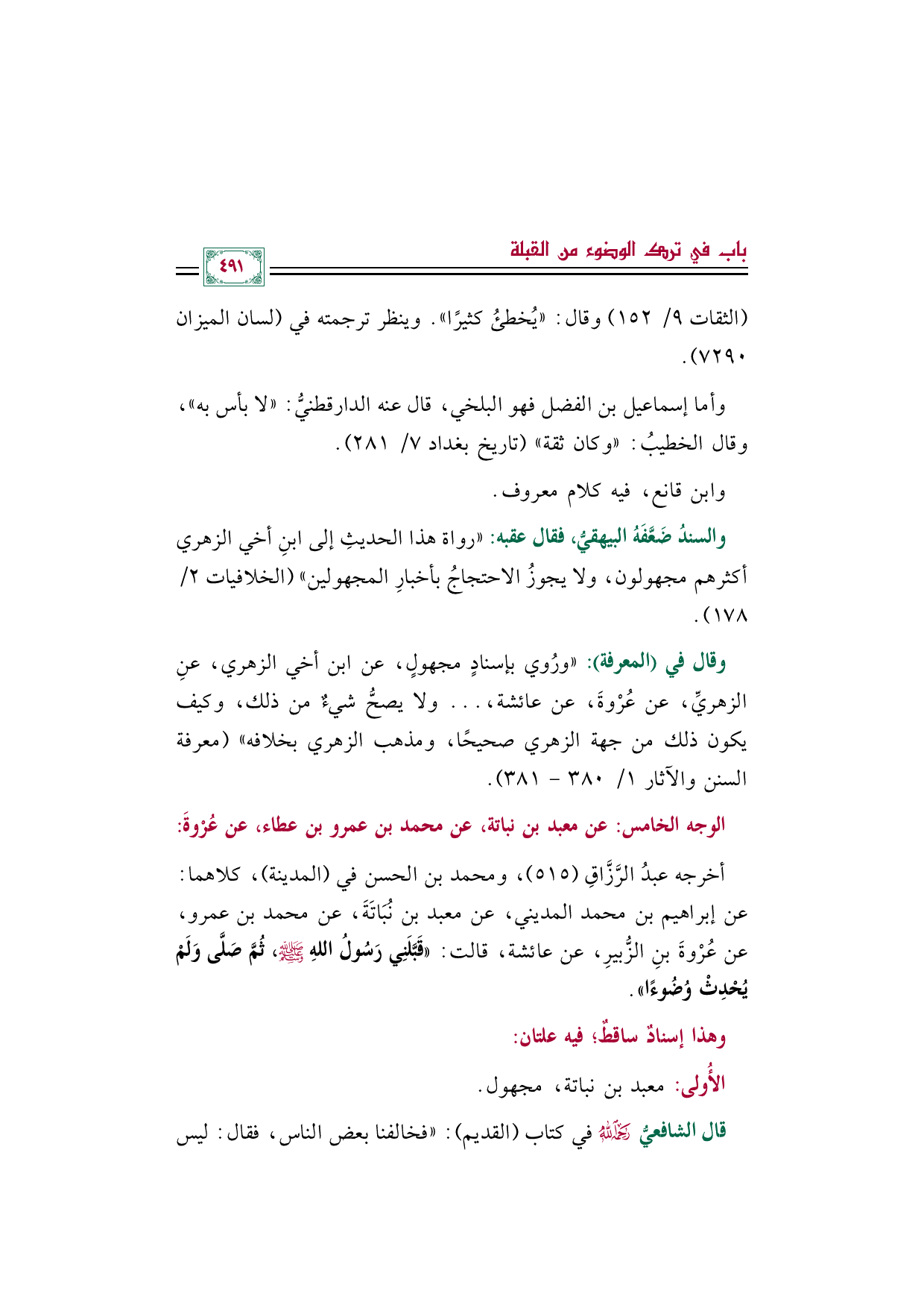 وقال في (المعرفة): "ورُوي بإسنادٍ مجهولٍ، عن ابن أخي الزهري، عنِ الزهريِّ، عن عُرْوةَ، عن عائشة، ... ولا يصحُّ شيءٌ من ذلك، وكيف يكون ذلك من جهة الزهري صحيحًا، ومذهب الزهري بخلافه" (معرفة السنن والآثار ١/ ٣٨٠ - ٣٨١).