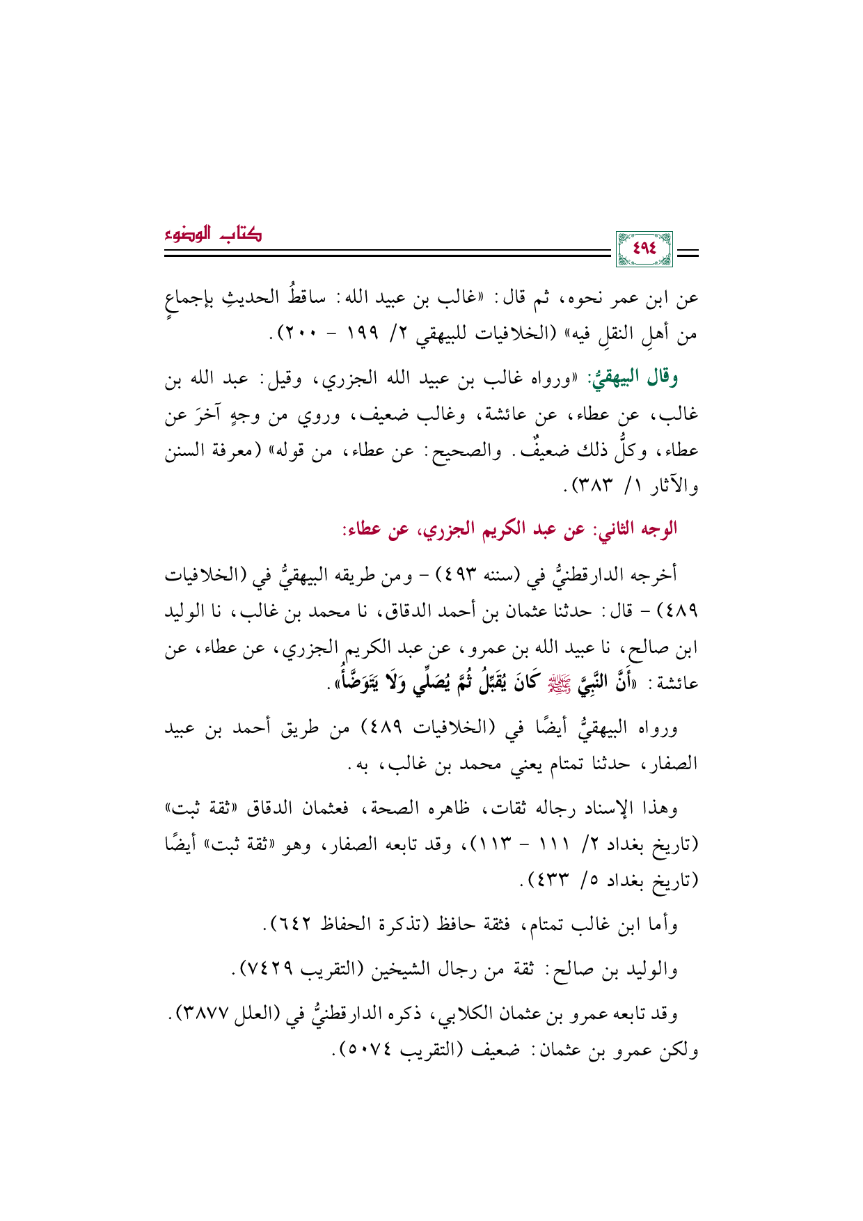 أخرجه الدارقطنيُّ في (سننه ٤٩٣) -ومن طريقه البيهقيُّ في (الخلافيات ٤٨٩) - قال: حدثنا عثمان بن أحمد الدقاق، نا محمد بن غالب، نا الوليد بن صالح، نا عبيد الله بن عمرو، عن عبد الكريم الجزري، عن عطاء، عن عائشة: ((أَنَّ النَّبِيَّ صلى الله عليه وسلم كَانَ يُقَبِّلُ ثُمَّ يُصَلِّي وَلَا يَتَوَضَّأُ)).
