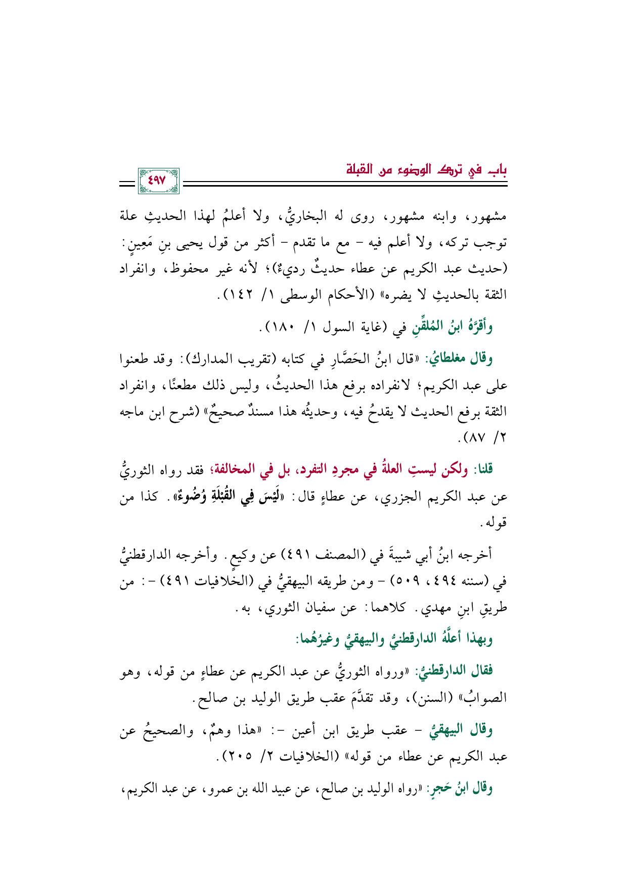 قلنا: ولكن ليستِ العلةُ في مجردِ التفرد، بل في المخالفة؛ فقد رواه الثوريُّ عن عبد الكريم الجزري، عن عطاءٍ قال: ((لَيْسَ فِي القُبْلَةِ وُضُوءٌ)). كذا من قوله.