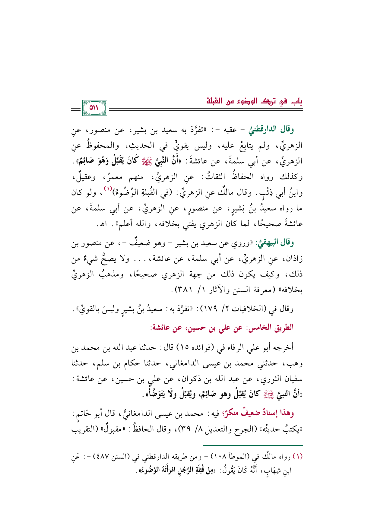 وقال الدارقطنيُّ -عقبه-: ((تفرَّدَ به سعيد بن بشير، عن منصور، عنِ الزهريِّ، ولم يتابعْ عليه، وليس بقويٍّ في الحديثِ، والمحفوظُ عنِ الزهريِّ، عن أبي سلمةَ، عن عائشةَ: ((أَنَّ النَّبِيَّ صلى الله عليه وسلم كَانَ يُقَبِّلُ وَهُوَ صَائِمٌ)). وكذلك رواه الحفاظُ الثقاتُ: عنِ الزهريِّ، منهم معمرٌ، وعقيلٌ، وابنُ أبي ذِئْبٍ. وقال مالكٌ عنِ الزهريِّ: (في القُبلةِ الوُضُوءُ) (¬١)، ولو كان ما رواه سعيدُ بنُ بَشيرٍ، عن منصورٍ، عنِ الزهريِّ، عن أبي سلمةَ، عن عائشةَ صحيحًا، لما كان الزهري يفتي بخلافه، والله أعلم)) اهـ.