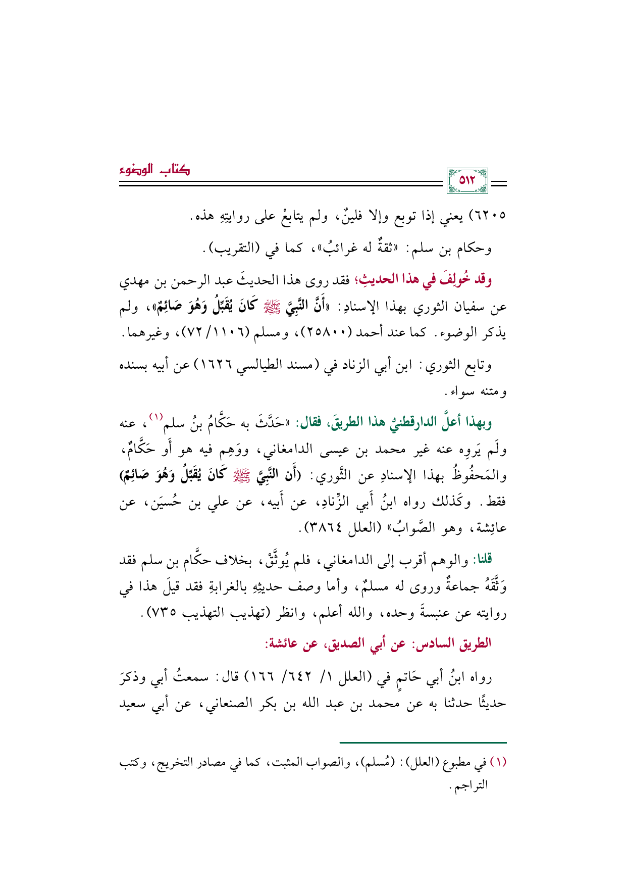 وبهذا أعلَّ الدارقطنيُّ هذا الطريقَ، فقال: ((حَدَّثَ به حَكَّامُ بنُ سلم (¬١)، عنه ولَم يَروِه عنه غير محمد بن عيسى الدامغاني، ووَهِم فيه هو أَو حَكَّامٌ، والمَحفُوظُ بهذا الإسنادِ عن الثَّوري: (أَن النَّبِيَّ صلى الله عليه وسلم كَانَ يُقَبِّلُ وَهُوَ صَائِمٌ) فقط. وكَذلك رواه ابنُ أَبي الزِّنادِ، عن أَبيه، عن علي بن حُسيَن، عن عائِشة، وهو الصَّوابُ)) (العلل ٣٨٦٤).