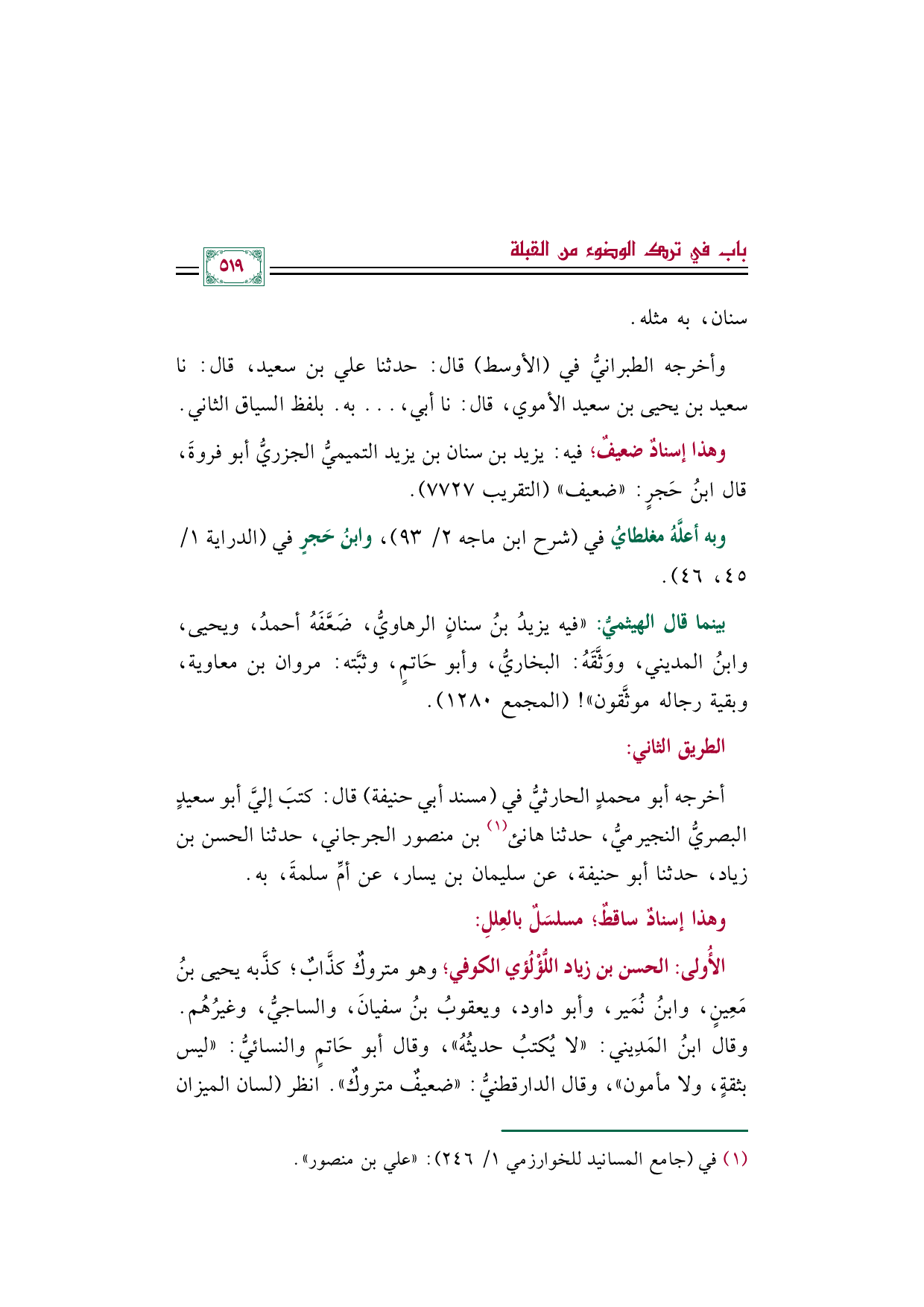 بينما قال الهيثميُّ: "فيه يزيدُ بنُ سنانٍ الرهاويُّ، ضَعَّفَهُ أحمدُ، ويحيى، وابنُ المديني، ووَثَّقَهُ: البخاريُّ، وأبو حَاتمٍ، وثبَّته: مروان بن معاوية، وبقية رجاله موثَّقون"! (المجمع ١٢٨٠).