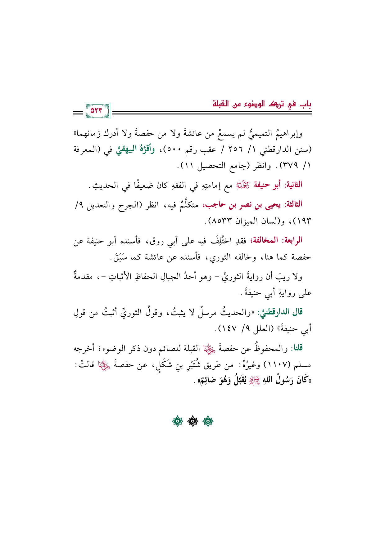 وإبراهيمُ التميميُّ لم يسمعْ من عائشةَ ولا من حفصةَ ولا أدرك زمانهما" (سنن الدارقطني ١/ ٢٥٦/ عقب رقم ٥٠٠)، وأقرَّهُ البيهقيُّ في (المعرفة ١/ ٣٧٩). وانظر (جامع التحصيل ١١).