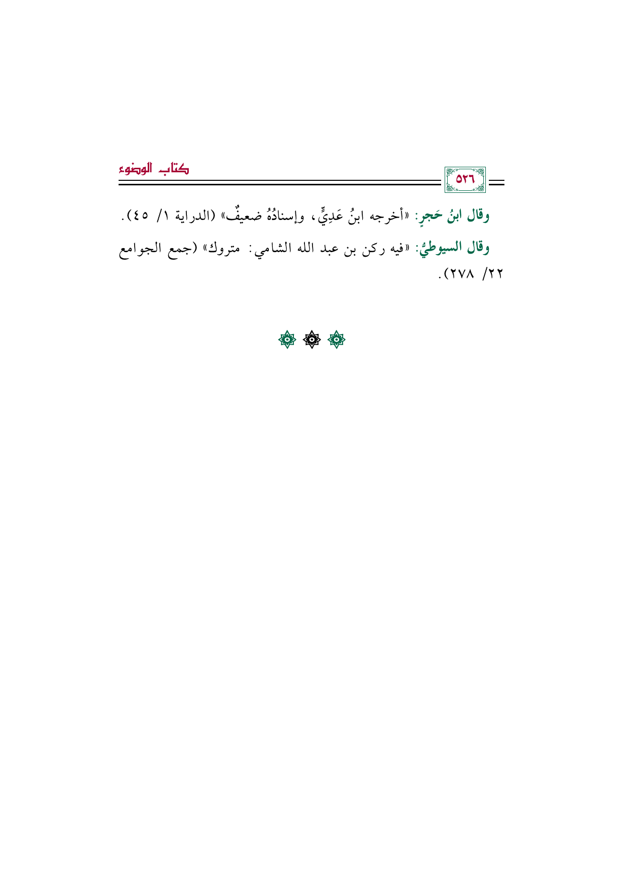 وقال السيوطيُّ: ((فيه ركن بن عبد الله الشامي: متروك)) (جمع الجوامع ٢٢/ ٢٧٨).