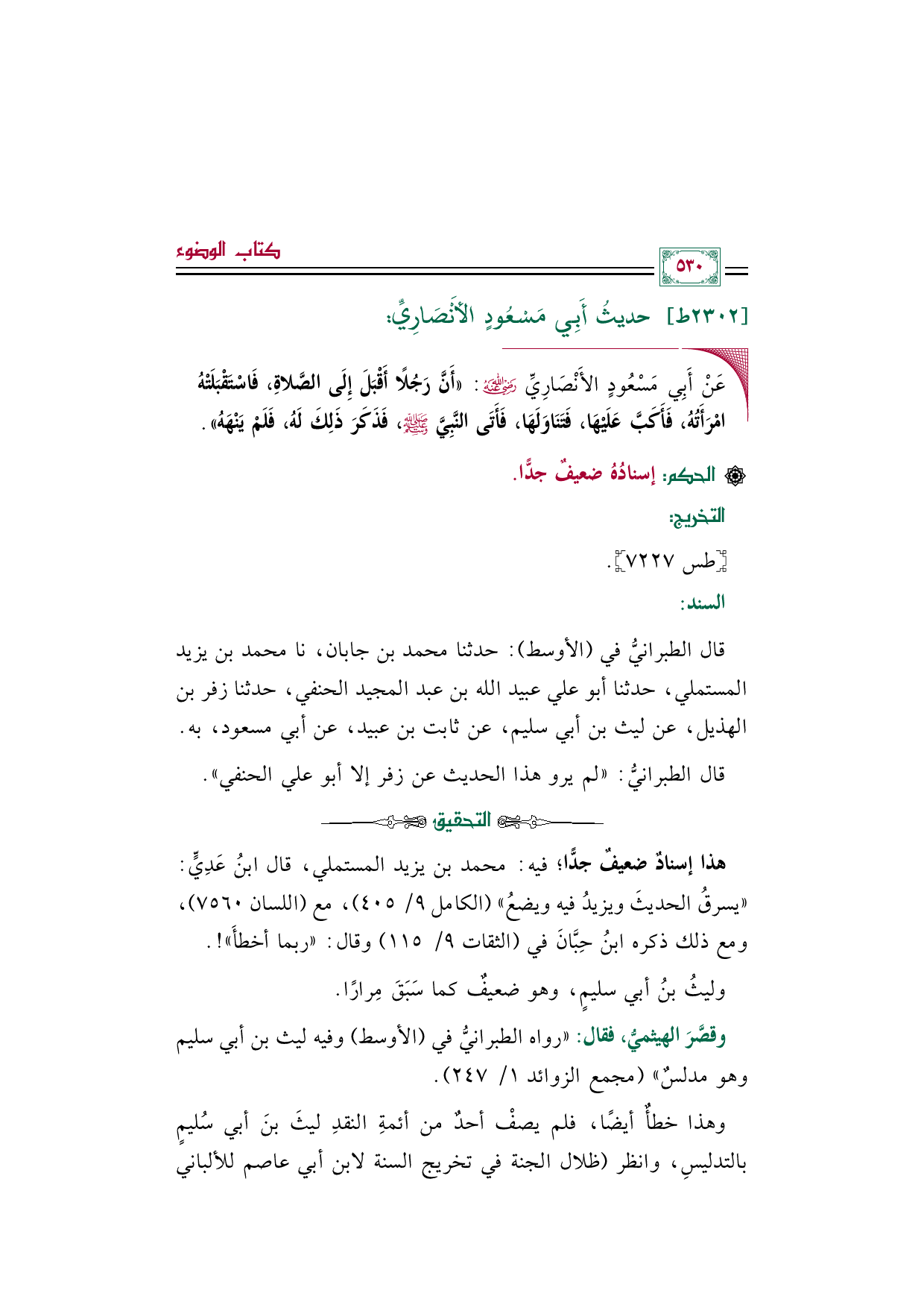 قال الطبرانيُّ في (الأوسط): حدثنا محمد بن جابان، نا محمد بن يزيد المستملي، حدثنا أبو علي عبيد الله بن عبد المجيد الحنفي، حدثنا زفر بن الهذيل، عن ليث بن أبي سليم، عن ثابت بن عبيد، عن أبي مسعود، به.